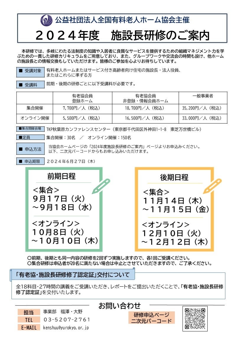 有料老人ホーム、サービス付き高齢者向け住宅の施設長等対象「2024年度 施設長研修」申込受付中!!