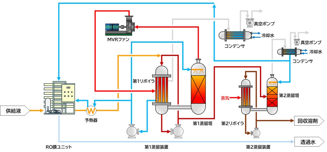 RO膜による前濃縮と凝縮水の処理に加え、沸点上昇によるMVRファンの負荷増を防ぐため、第1蒸留装置での抜出を中間濃度に抑え、高純度溶剤を回収する第2蒸留装置にあえて蒸気式を採用しました。これにより、これまでにない最高の省エネ性を達成することができました。