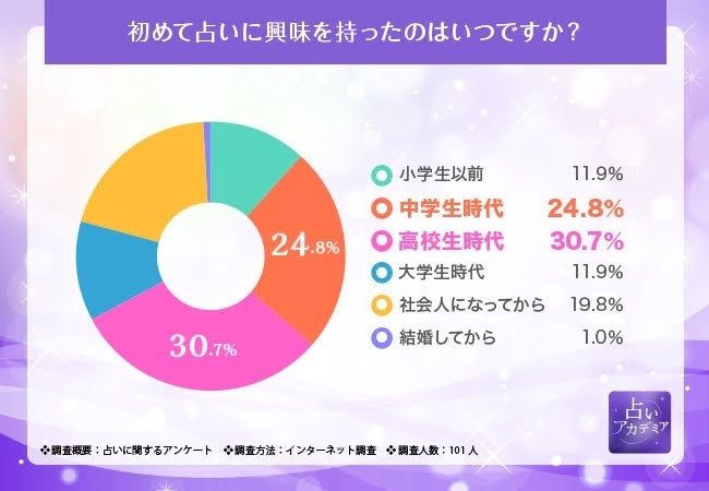 初めに「初めて占いに興味を持ったのはいつですか?」と質問したところ、「高校生時代」と答えた人が30.7%でした。