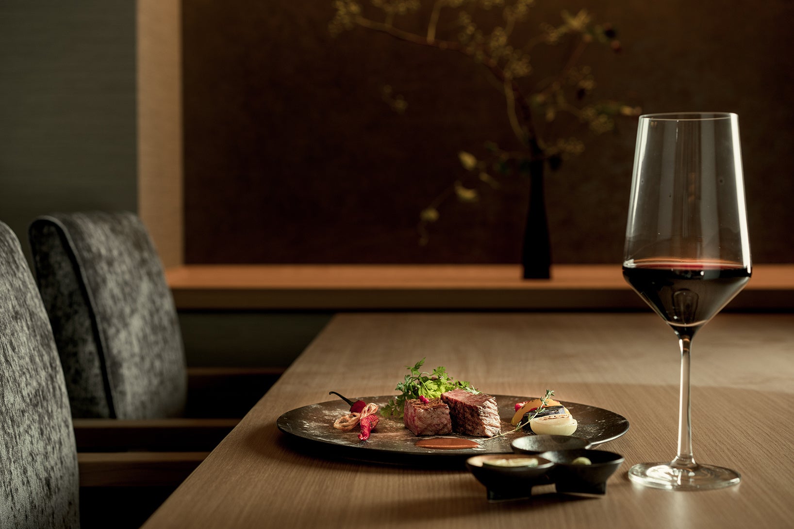 はつはなでは夕食の懐石料理を、ソムリエによるワインペアリングとともにご堪能いただけます。日本酒やワインに限らず特別なお茶などから、よりお食事が引き立つものをセレクトし、その場でアレンジしながらご提供いたします。