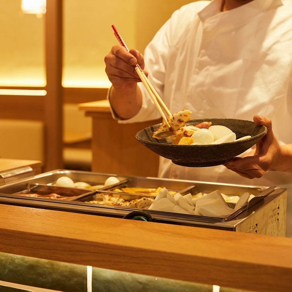 料理人が何度も試行錯誤し誕生した、当店自慢のこだわりのおでんは優しい京出汁の味わい。