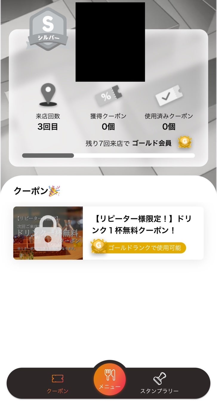 来店回数に応じてランクが上がり、ランクに応じてお得なクーポンを獲得することができます。