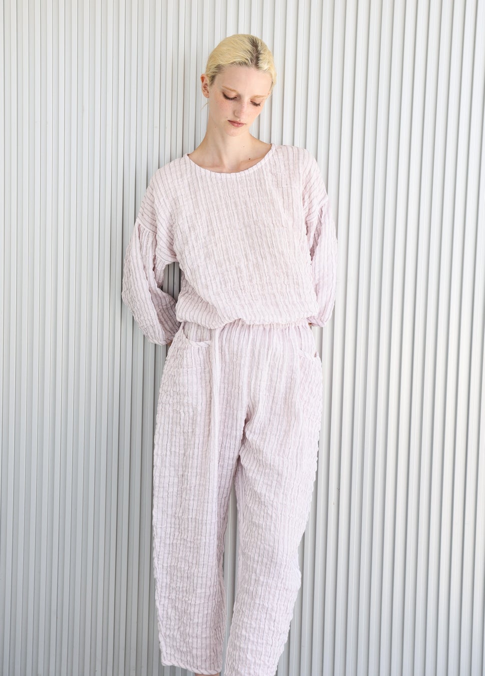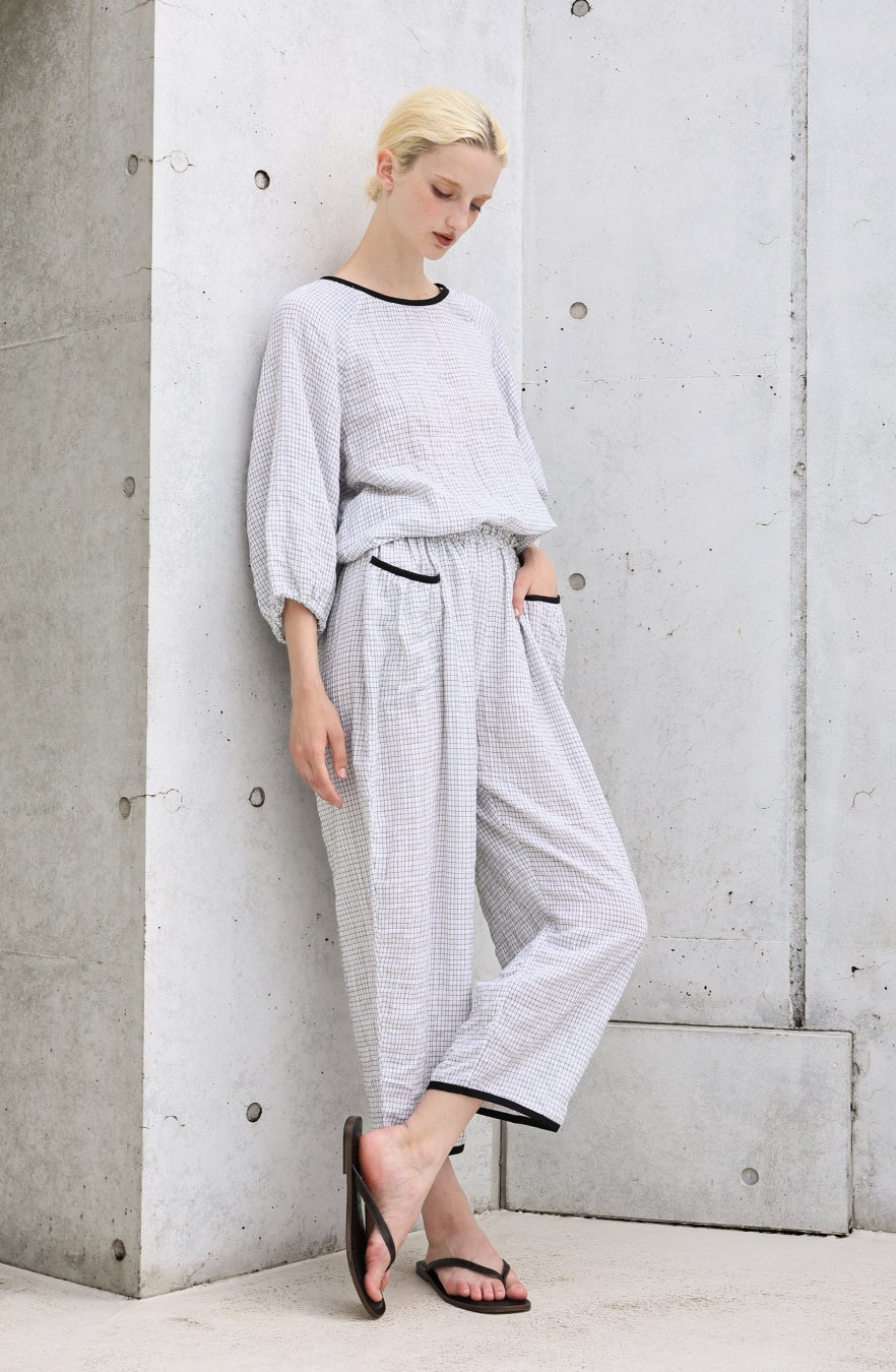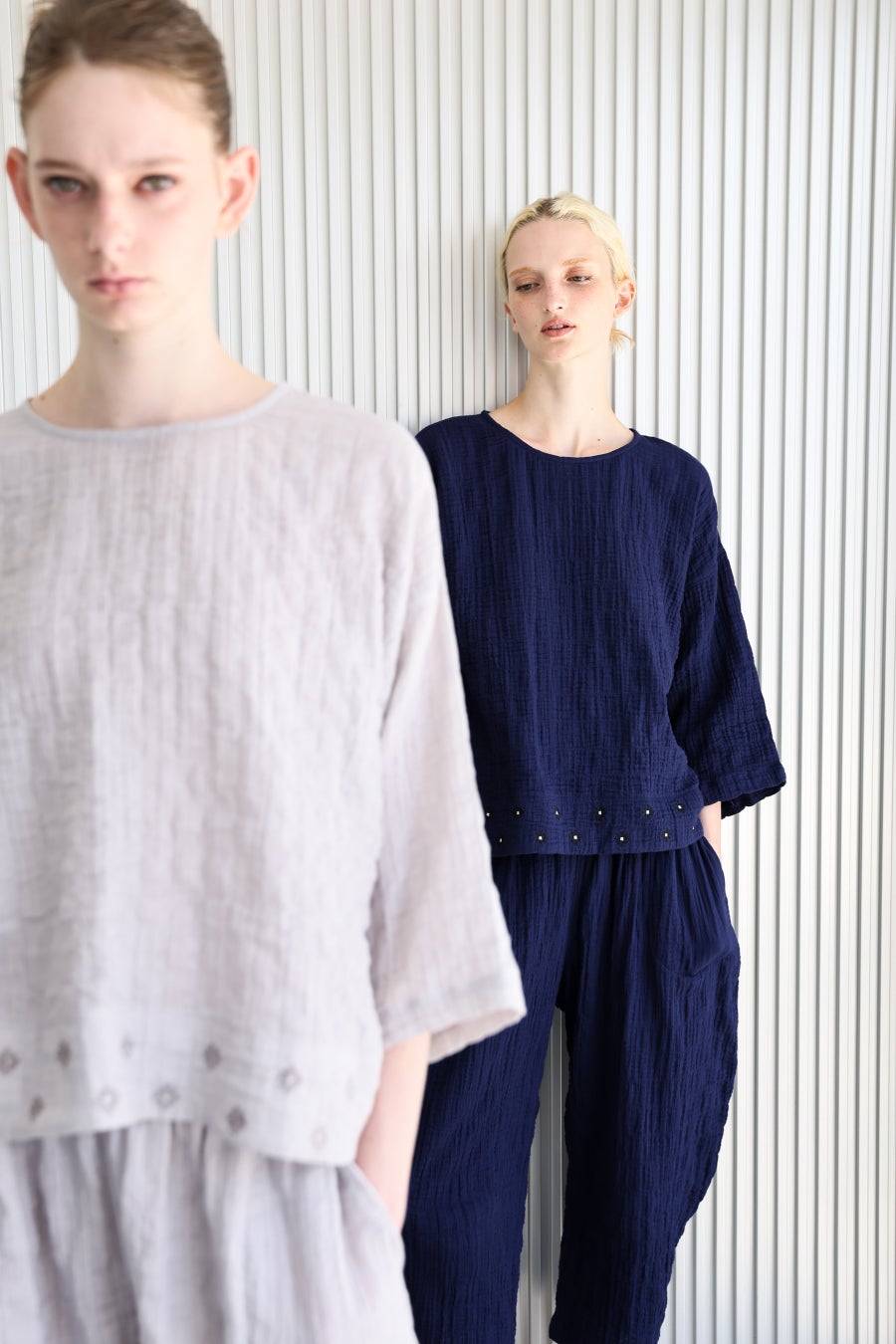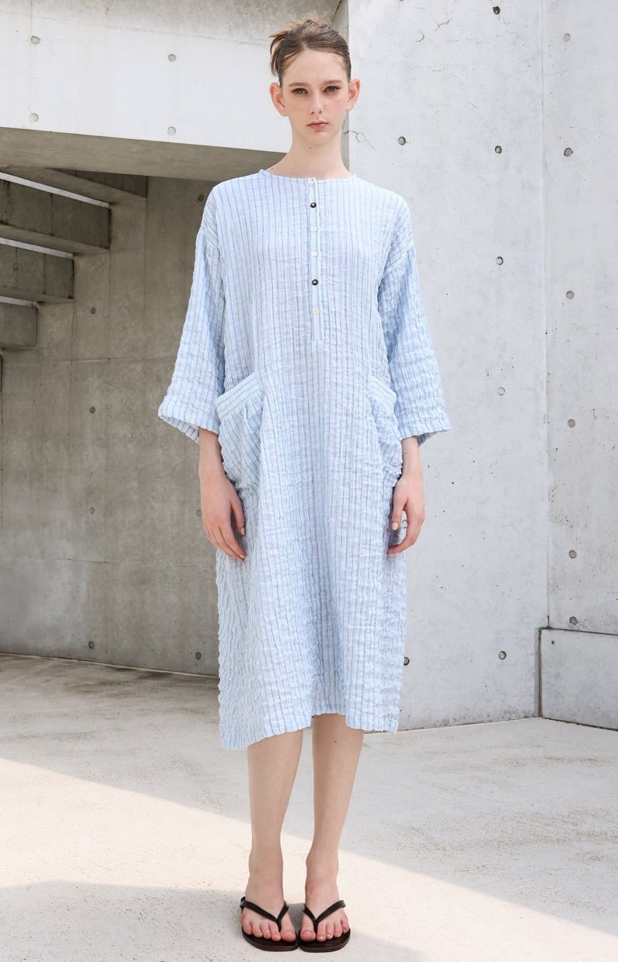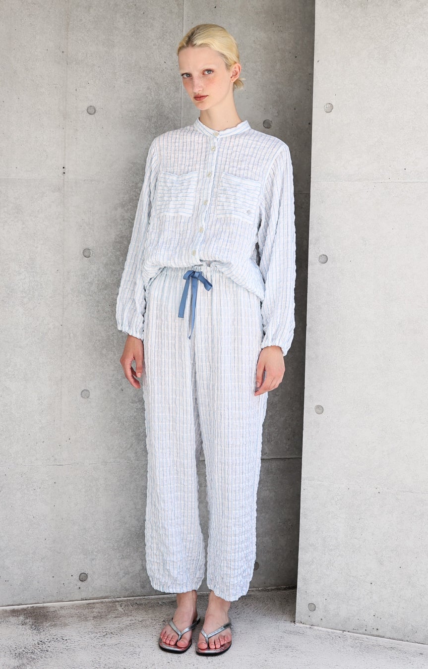 コットン素材ならではのやさしい肌触りに、シャーリング加工による自然なシワと凹凸を施すことで、空気をまとうような軽やかさと、さらりとした着心地を両立。生地が肌に触れる面積が少なく、春先に気になりやすいべたつきを抑えます。