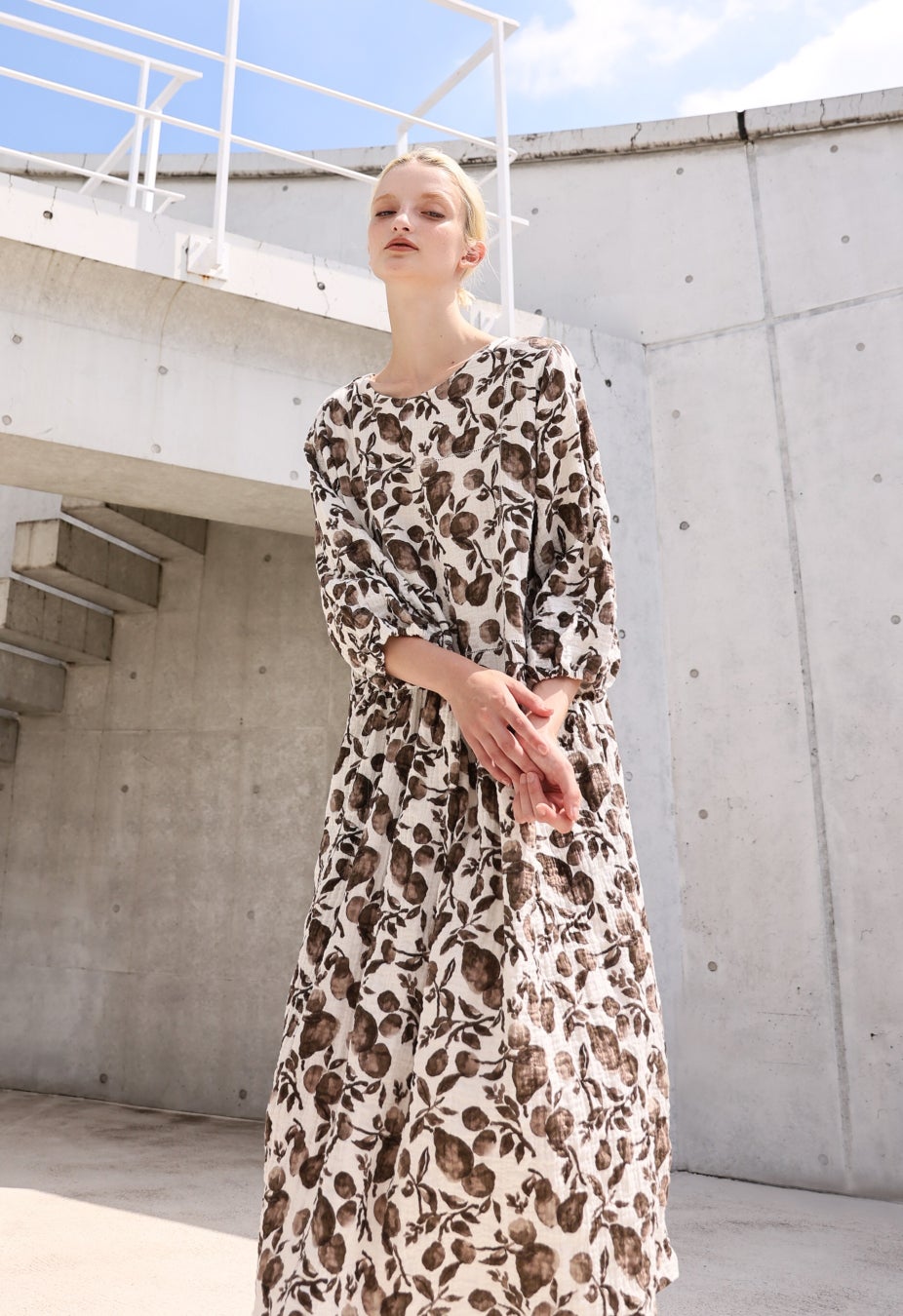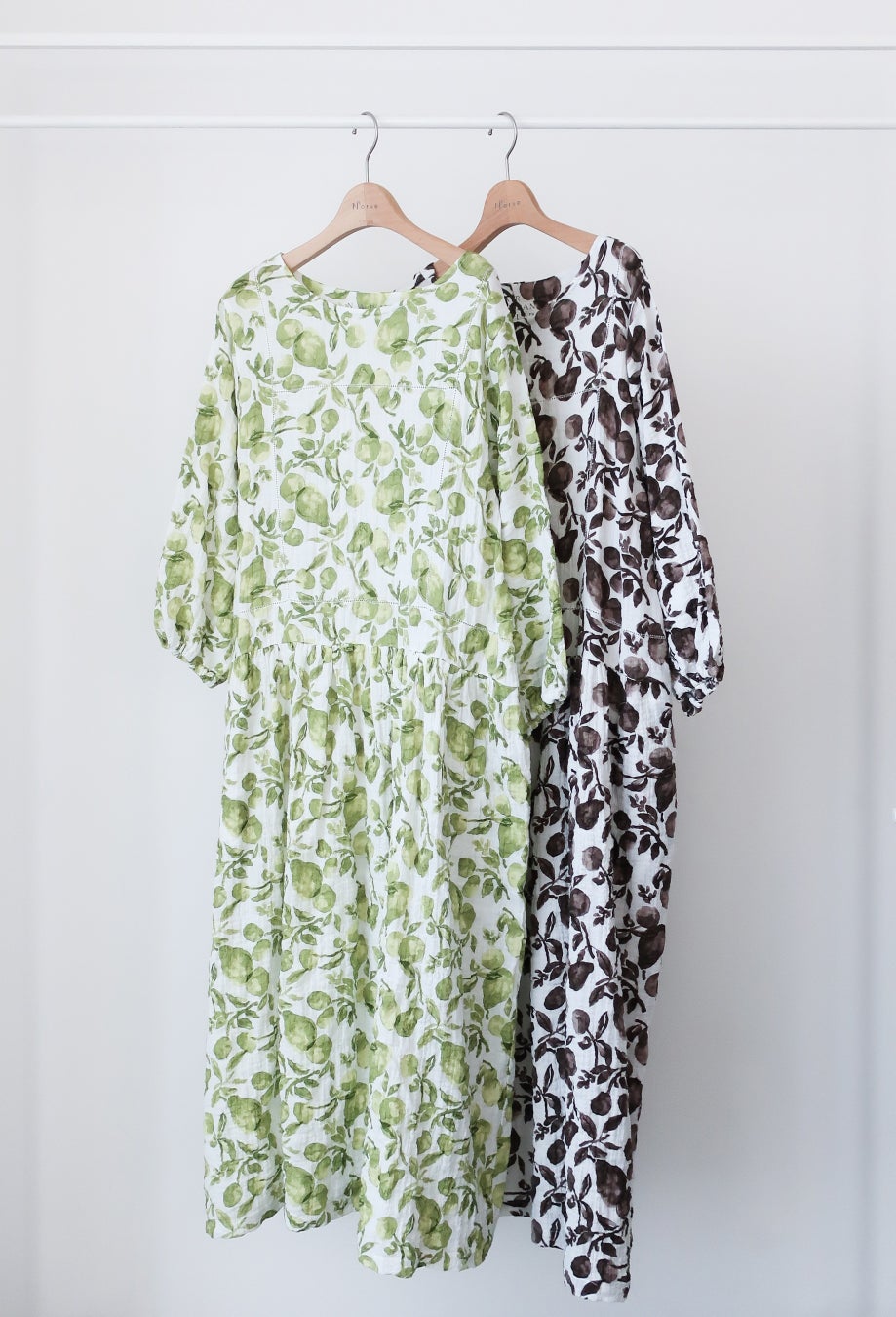 水彩タッチのボタニカルプリントが、やさしく春らしい表情を添えるデザイン