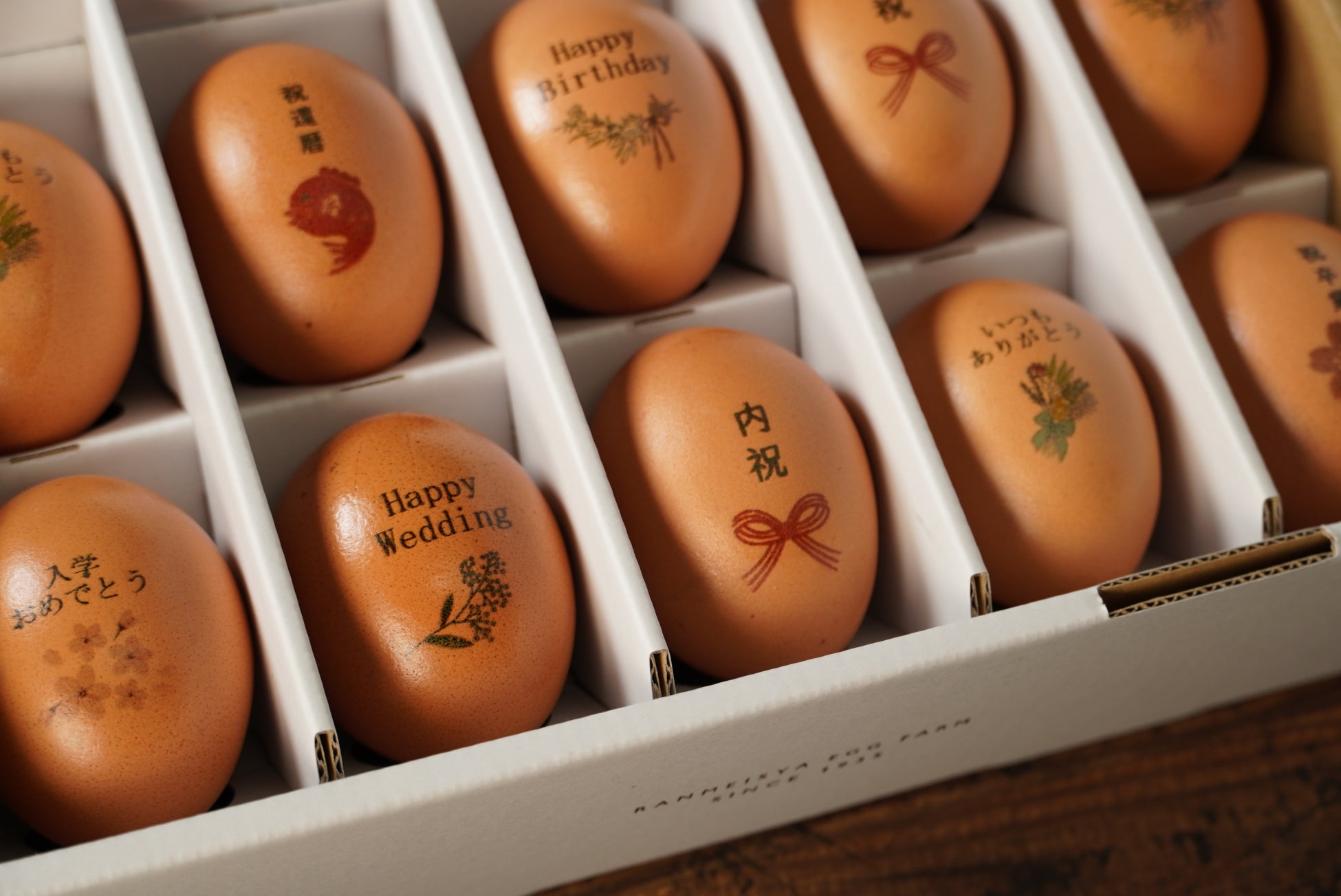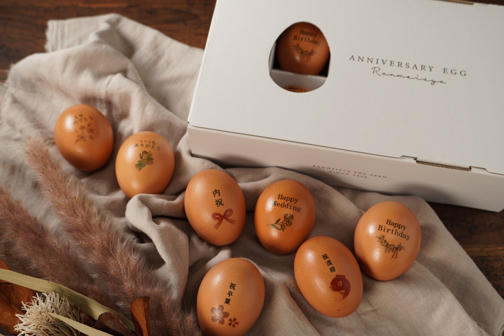 卵は昔から「幸運を招く」、「生命の象徴」などの意味を持ち、その栄養の高さからも贈り物として喜ばれてきた食材。30種類以上の飼料を自家配合した特別飼料を食べて育った鶏が産む自社ブランド卵「磨宝卵ゴールド」の殻にお好きなメッセージや画像をプリントできる新サービスが「アニバーサリーエッグ」です。思いでの写真や作成した画像やイラスト、企業ロゴを入れてのPRなどどんなプリントをするのかアイディアは無限大。