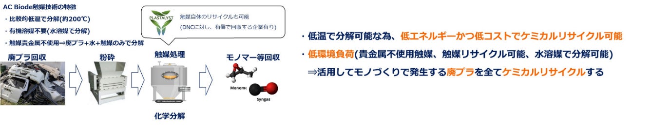 本取り組みでは、DNCの製造工程で発生する廃プラスチックを、AC Biodeのケミカル技術によってモノマーやガスに分解し、それらを化学メーカーへ提供するというリサイクルスキームの構築を構想しています。