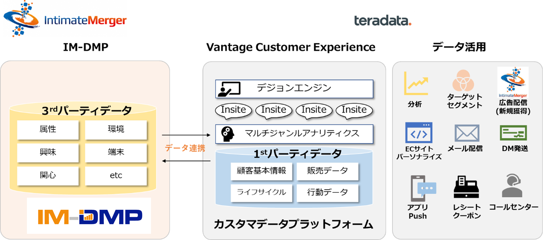 そこで今回、当社の「IM-DMP」をテラデータの主力製品であるマルチクラウド・データウェアハウス・ソフトウェア「Teradata Vantage」に提供しました。これにより、3rd Party Dataの活用も行えるようになることで「Vantage CX」は消費者像のより詳細な理解に基づく高度なマーケティングや効率的なビジネスプロセスを実現し、企業の意思決定の透明性の向上、新規顧客の獲得率や既存顧客のLTV(Life Time Value:顧客生涯価値)を飛躍的に向上させることが可能になります。
