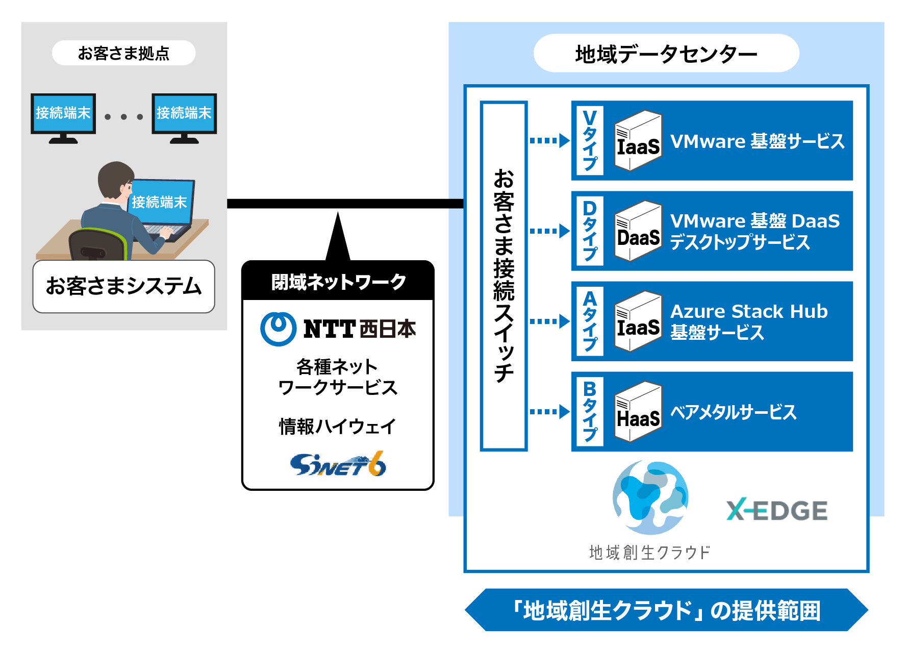 各地域に配備するクラウド基盤「X-EDGE」と、堂島キャンパス(大阪府)に配備するさまざまな機能や外部クラウドサービスとの連携が可能なクラウド基盤「X-HUB」を組み合わせたハイブリッド構成によるクラウドサービスを提供します。