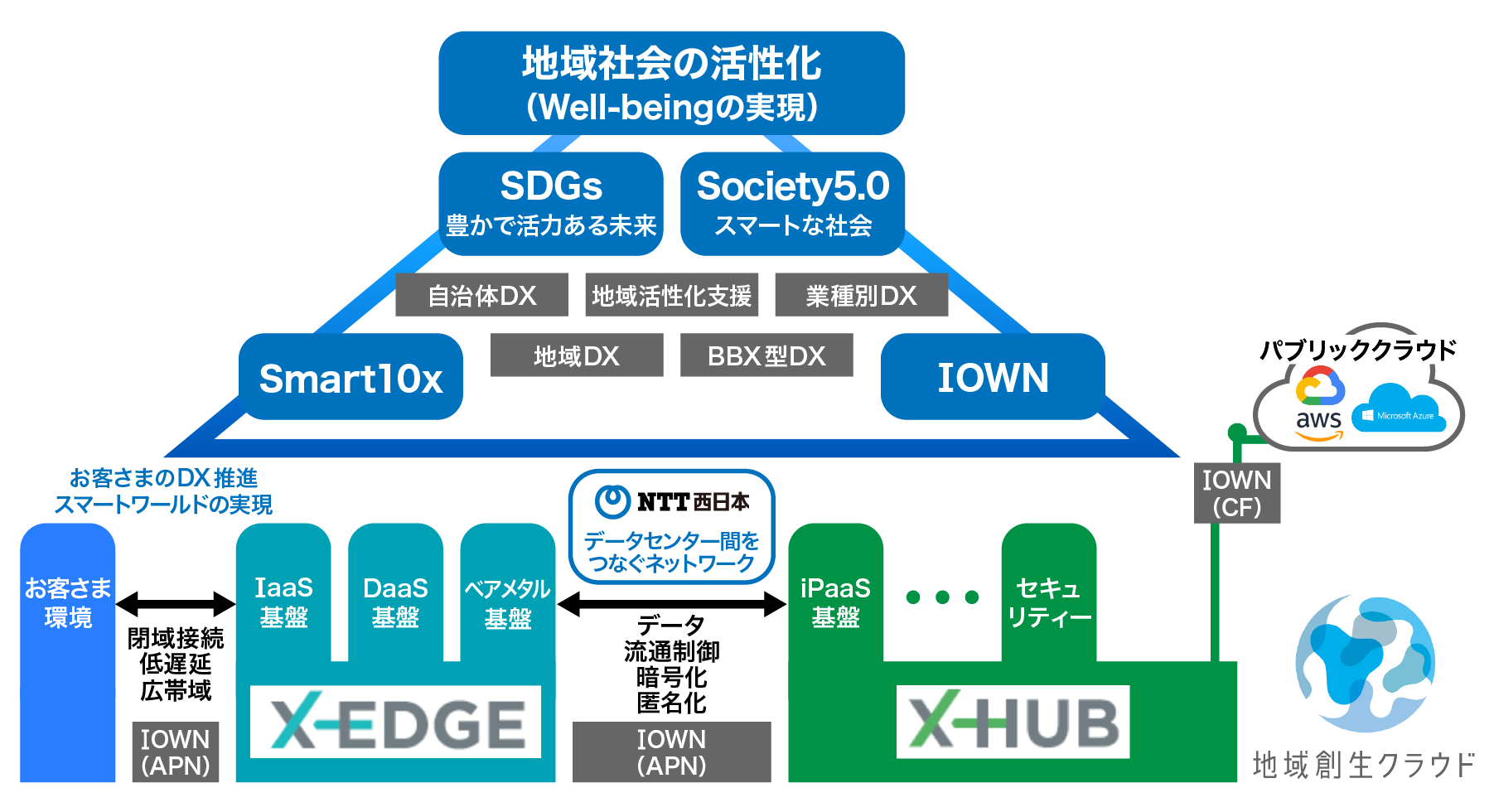 具体的には、従来の地域創生クラウドサービスに加えて、西日本エリア※1の各地域に新たなクラウド基盤(X-EDGE:クロスエッジ)を設置していきます。また、堂島キャンパス※2(大阪府)に外部クラウドサービスとの連携等が可能なクラウド基盤(X-HUB※3:クロスハブ)を設置します。お客さまの重要なデータを地域にてお預かりする「X-EDGE」、ならびにX-EDGEや各種クラウドサービスを連結してトータルとしての価値を産み出す「X-HUB」を提供いたします。また、「地域創生クラウド」は「X-EDGE」と「X-HUB」全体を表す統一的なブランドとして再定義いたします。これによりNTT西日本グループの推進するSmart10x※4やNTTグループの提唱するIOWN構想※5の実現、および地域社会の活性化に更に貢献していきたいと考えています。