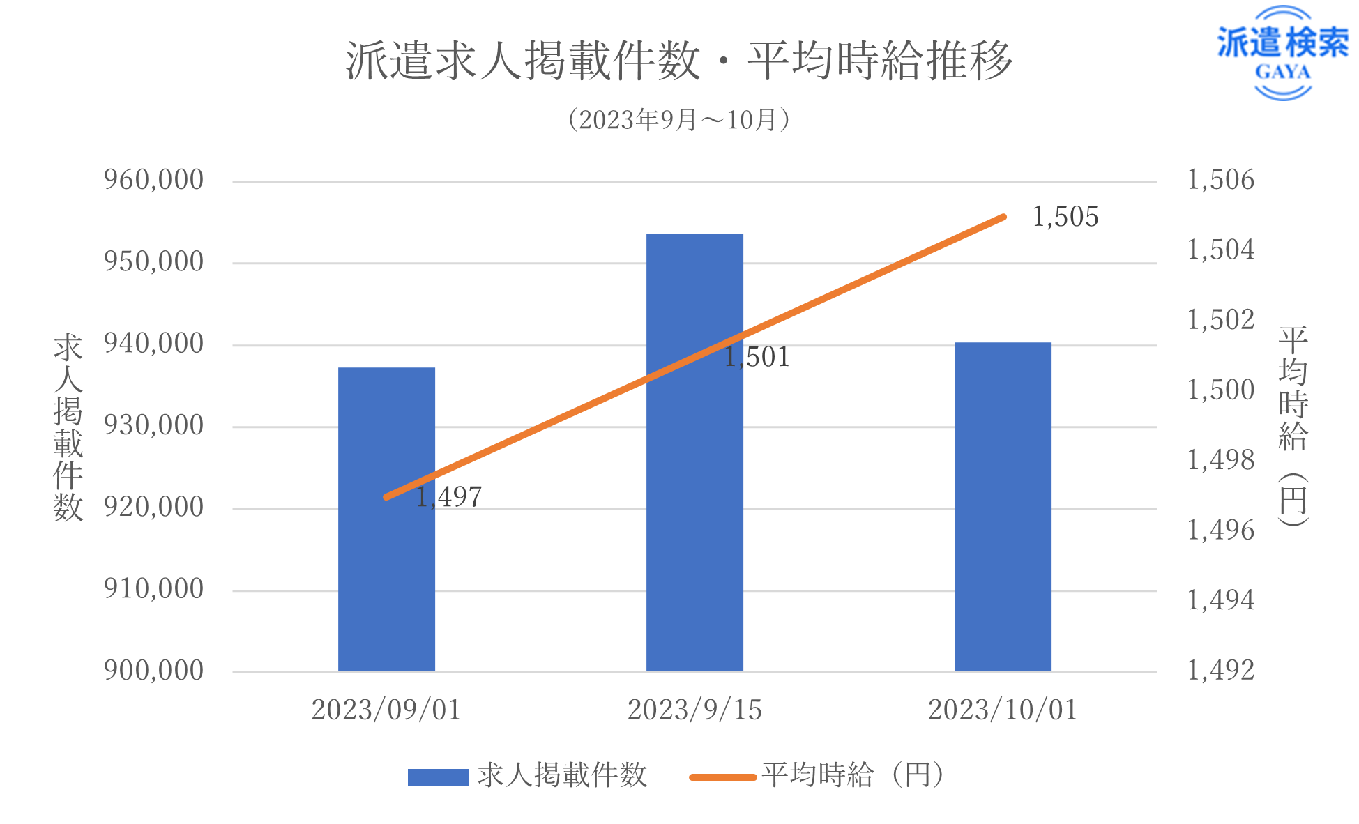 2023年9月1日~2023年10月1日派遣求人掲載件数・平均時給の推移についてデータ算出しました。派遣求人掲載件数では増減はあったものの、9月937,248件を3,108件上回る10月940,356件が掲載されました。平均時給は緩やかに上昇し9月1,497円を8円上回り、10月1,505円となりました。2023年10月の最低賃金引き上げでは47都道府県で、39円~47円の引上げとなりました。しかしGAYAに掲載されている派遣求人の時給の上昇は、9月と10月を比較しても8円と止まりました。要因として直接雇用のパート・アルバイトの賃金より派遣社員の賃金設定の方が比較的高く、今回の最低賃金にかかる求人が少なかったことが考えられます。