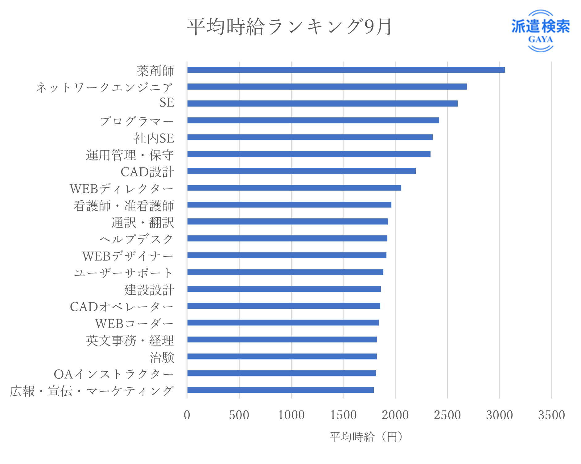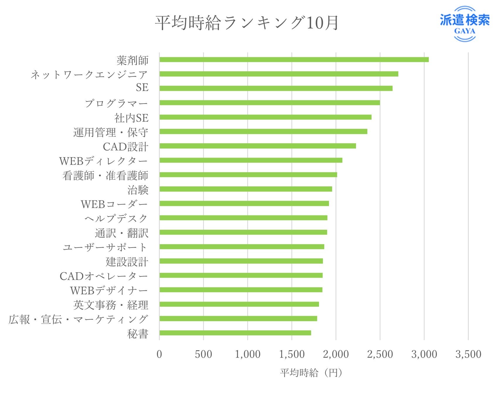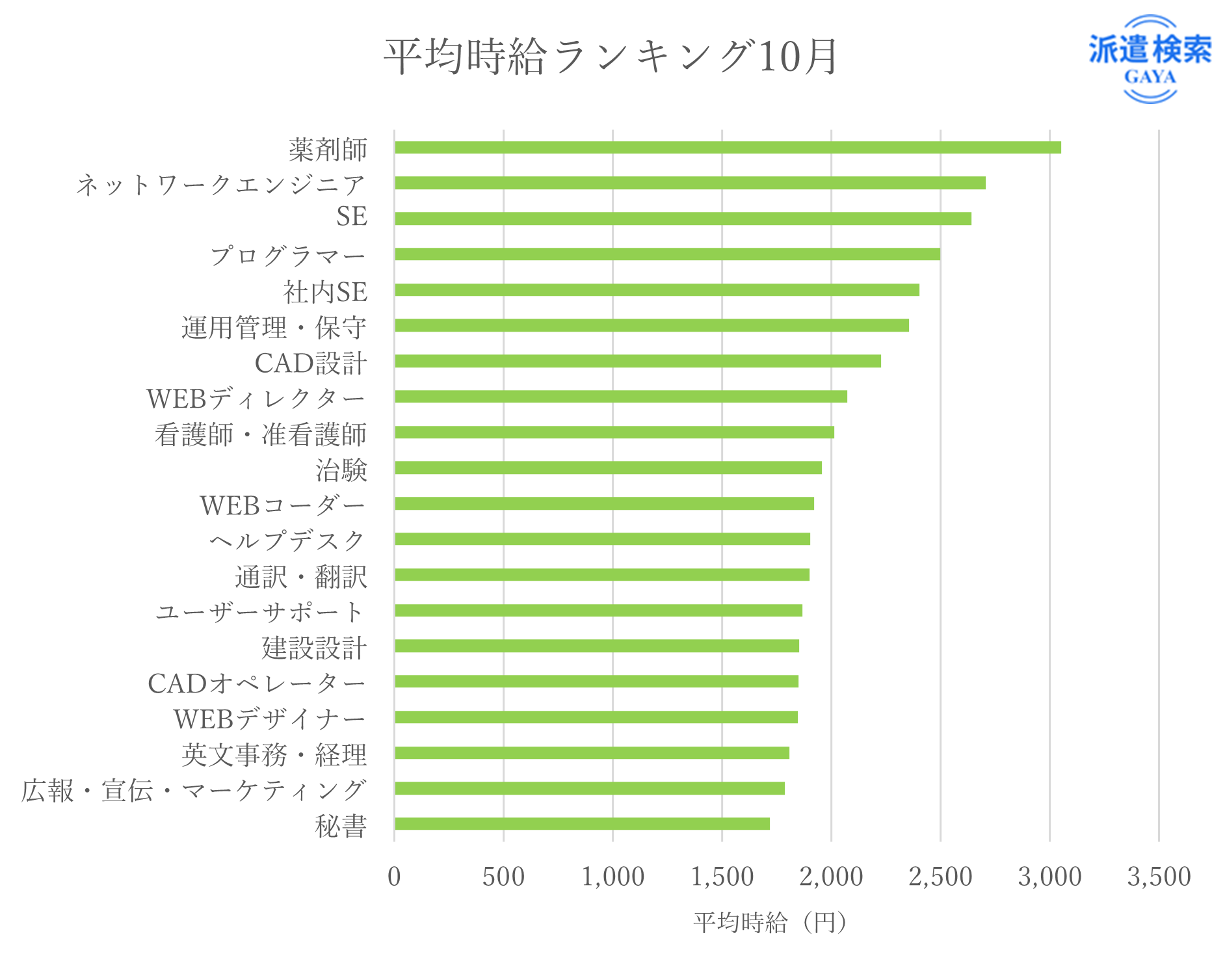 1位薬剤師、2位ネットワークエンジニア、3位SE、4位プログラマー、5位社内SE、6位運用管理・保守、7位CAD設計、8位、9位看護師・准看護師までは9月と10月のランキングの変化はありませんでした。10位以下につきましてもランキングの変化はあるものの20位までに入っている職種はほとんど同じで9月のOAインストラクターに変わって10月は秘書がランキングに入りました。
