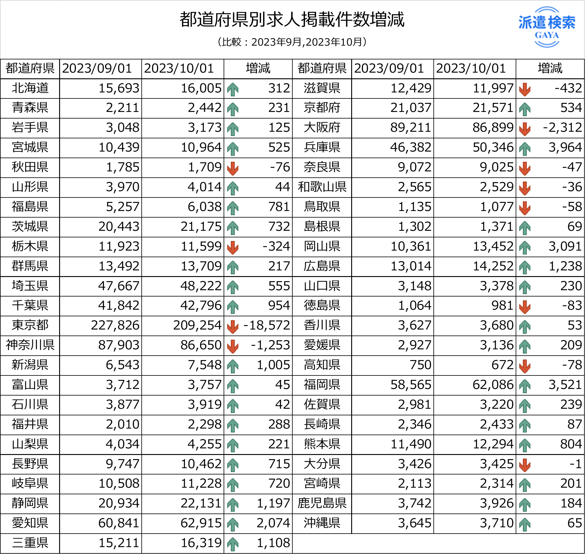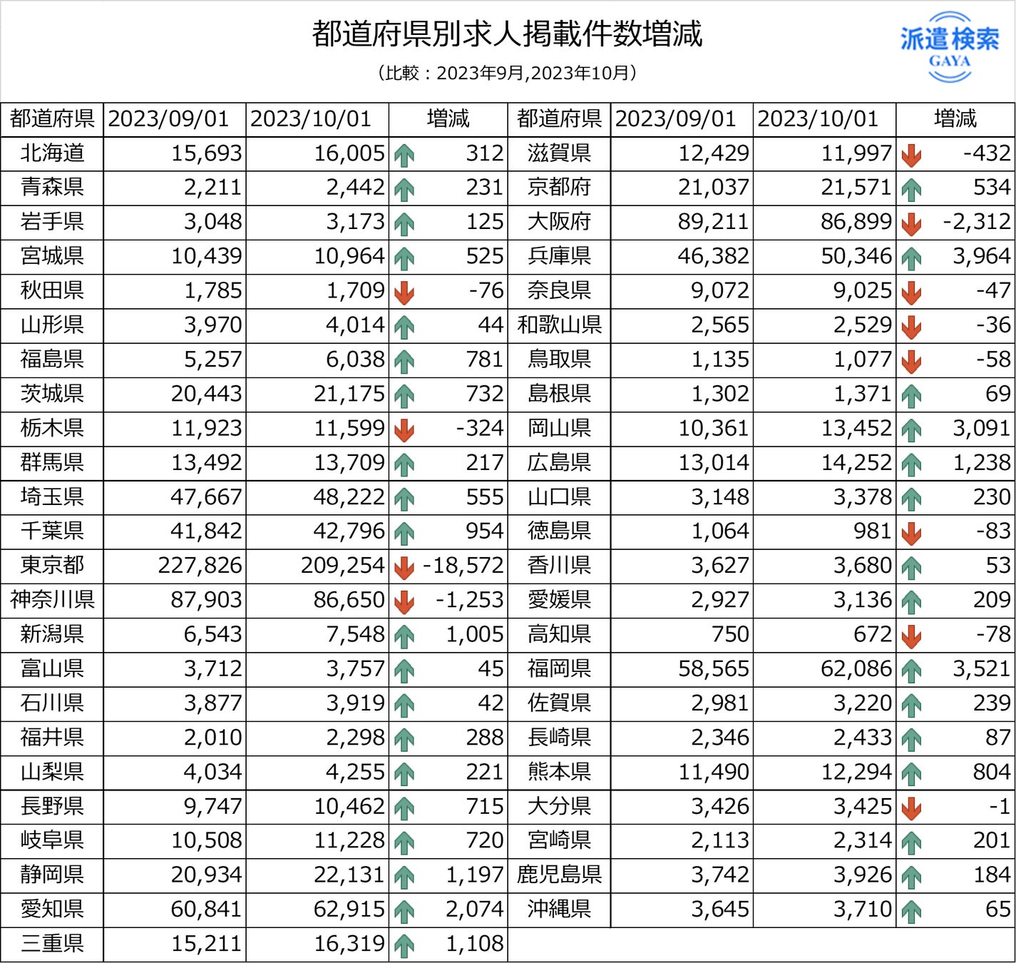 【9月度10月度派遣求人情報比較】派遣求人増減ワースト1位は東京-18,572件、増加1位は兵庫県+3,964件