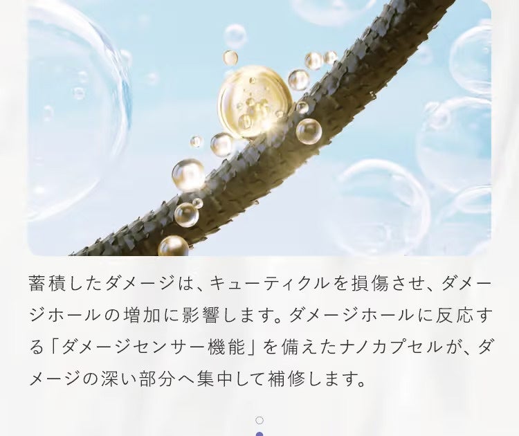 ナノカプセル化した2種類の毛髪補修成分を独自比率で組み合わせた「ナノリペアW EX*⁴」が、ダメージセンサー機能でダメージホールを探して効率的に浸透し、髪を内側から補修します。