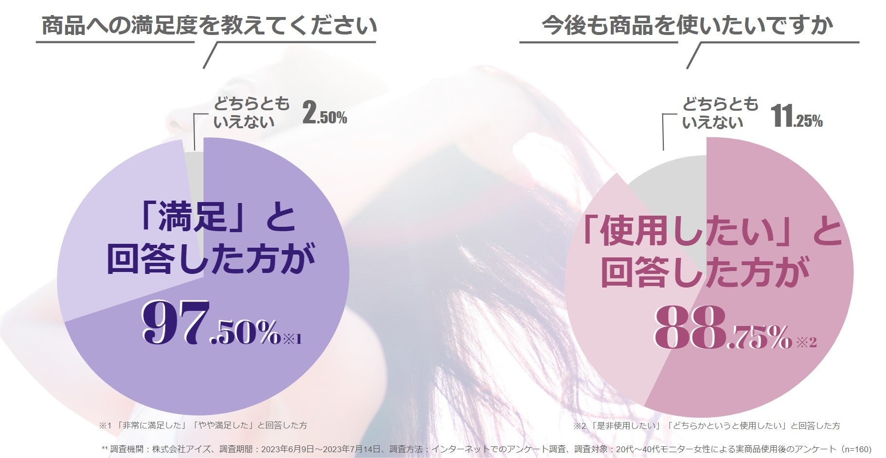 *¹:調査機関:株式会社アイズ、調査期間:2023年6月9日~2023年7月14日、調査方法:インターネットでのアンケート調査、調査対象:20代~40代モニター女性による実商品使用後のアンケート(n=160)