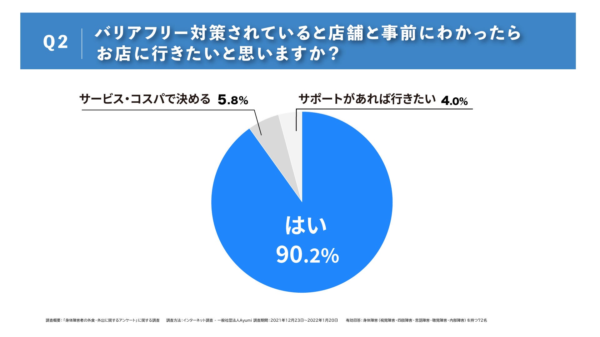 ■バリアフリー対策されている店舗だと事前にわかったら、お店にいきたいという人が90.2%、残りの9.8%もサービス内容や店舗の入店サポート可能かどうかが事前にわかればお店にいきたいと回答。