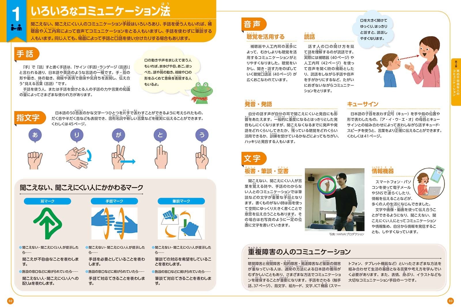 2章では、聞こえない/聞こえにくい人たちのコミュニケーション方法を取り上げました。手話、聴覚口話法、音声、文字などさまざまなコミュニケーション方法やその特徴を学びます。