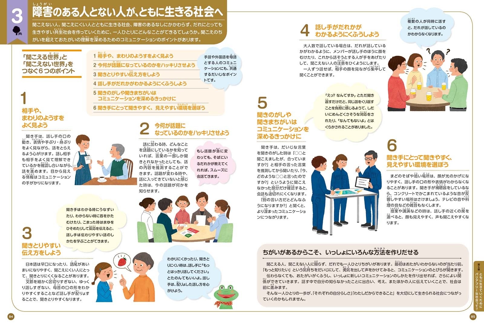 6章では、聞こえない/聞こえにくい人が、どんな時に「不自由」なのか、というところを出発点に、バリアフリーな社会をつくる一員として、自分にできることを考え、行動するための章です。