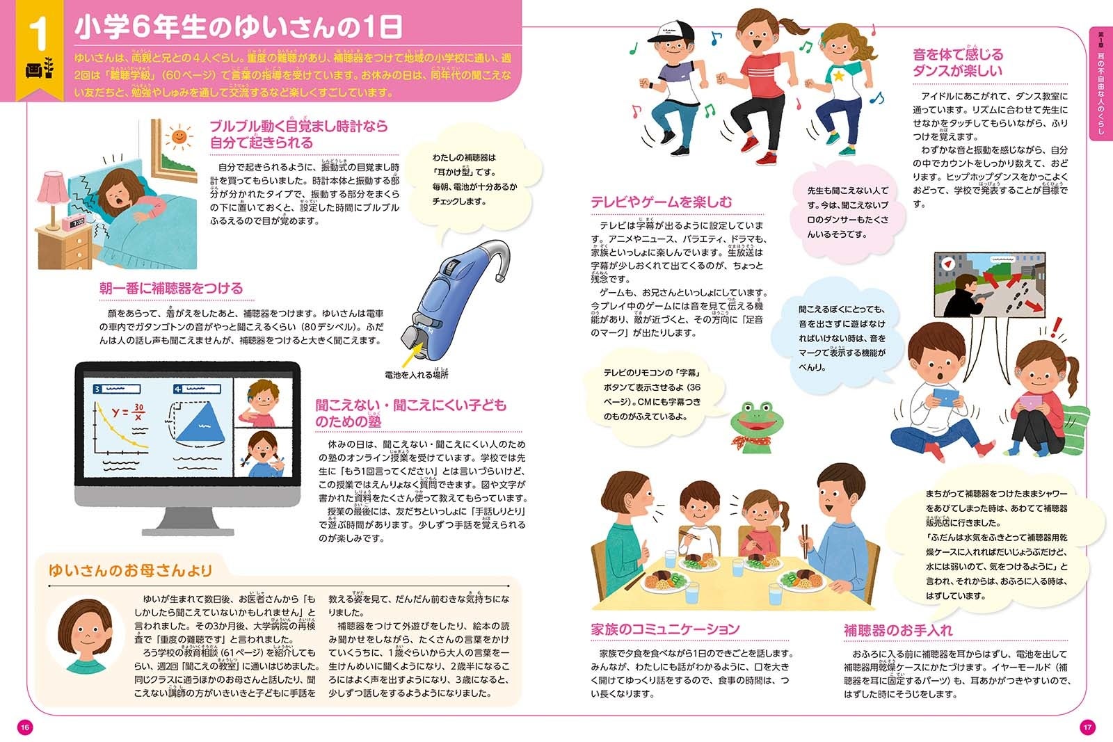 聴覚障害のある人のくらしのようすや、日常を支えるグッズやサービス、学校生活、仕事の様子、当事者からのメッセージなどで学び、考えます。