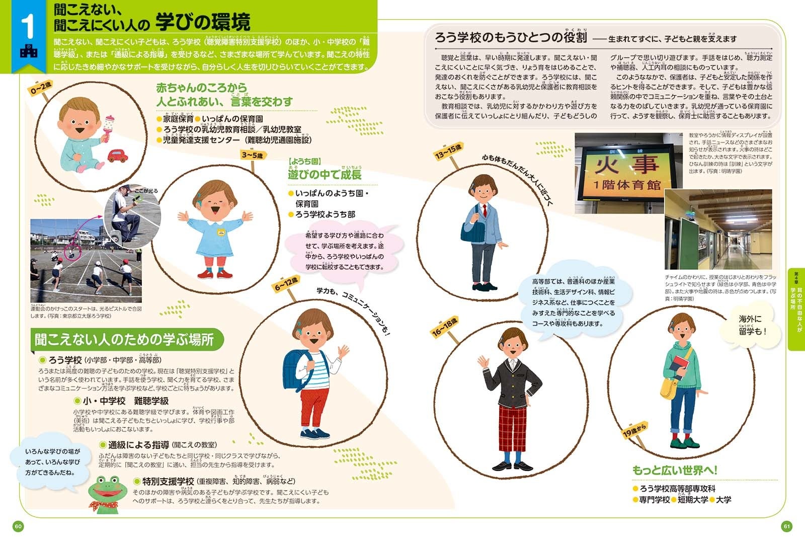 4章では、聞こえない/聞こえにくい子どもたちの学びの環境を紹介しました。私立校2校、公立校1校の学校の特色、学校生活のようすと、視覚障害のある人のための大学に通う学生たちの声を取り上げました。