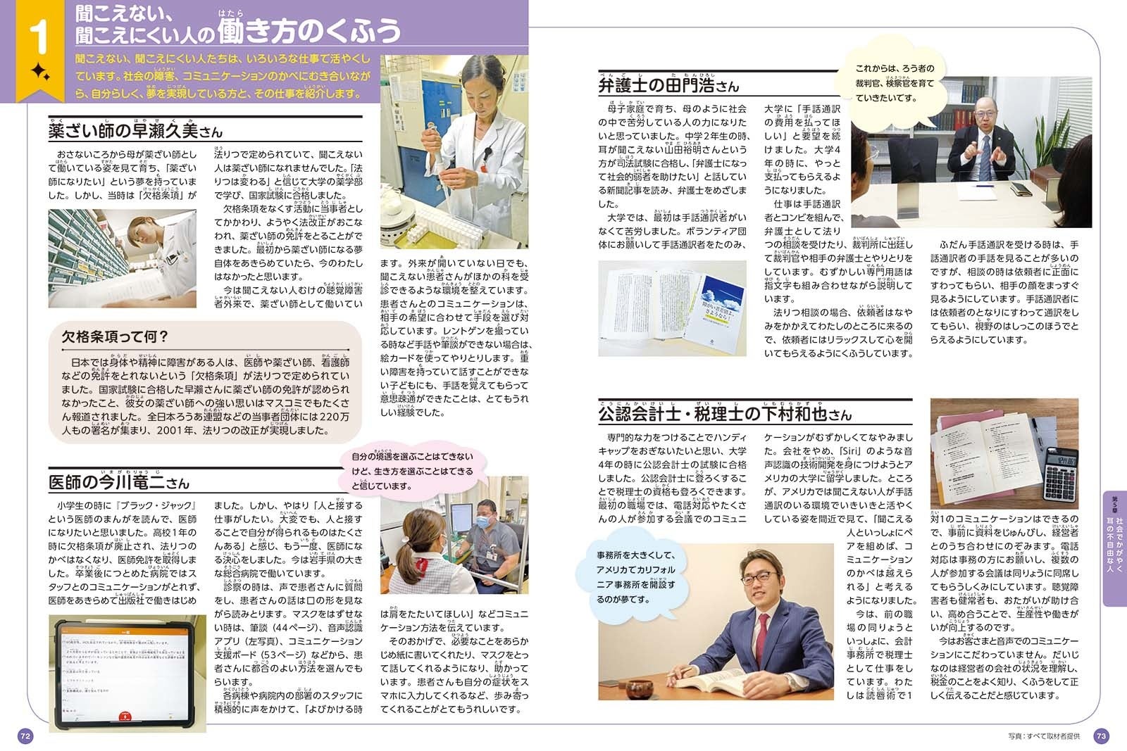 3章では、聞こえない/聞こえにくい人たちが、よりよくくらせるための仕事や社会のくふうを取り上げました。社会のくふうやアイデアで、軽減される「不自由さ」があるのです。