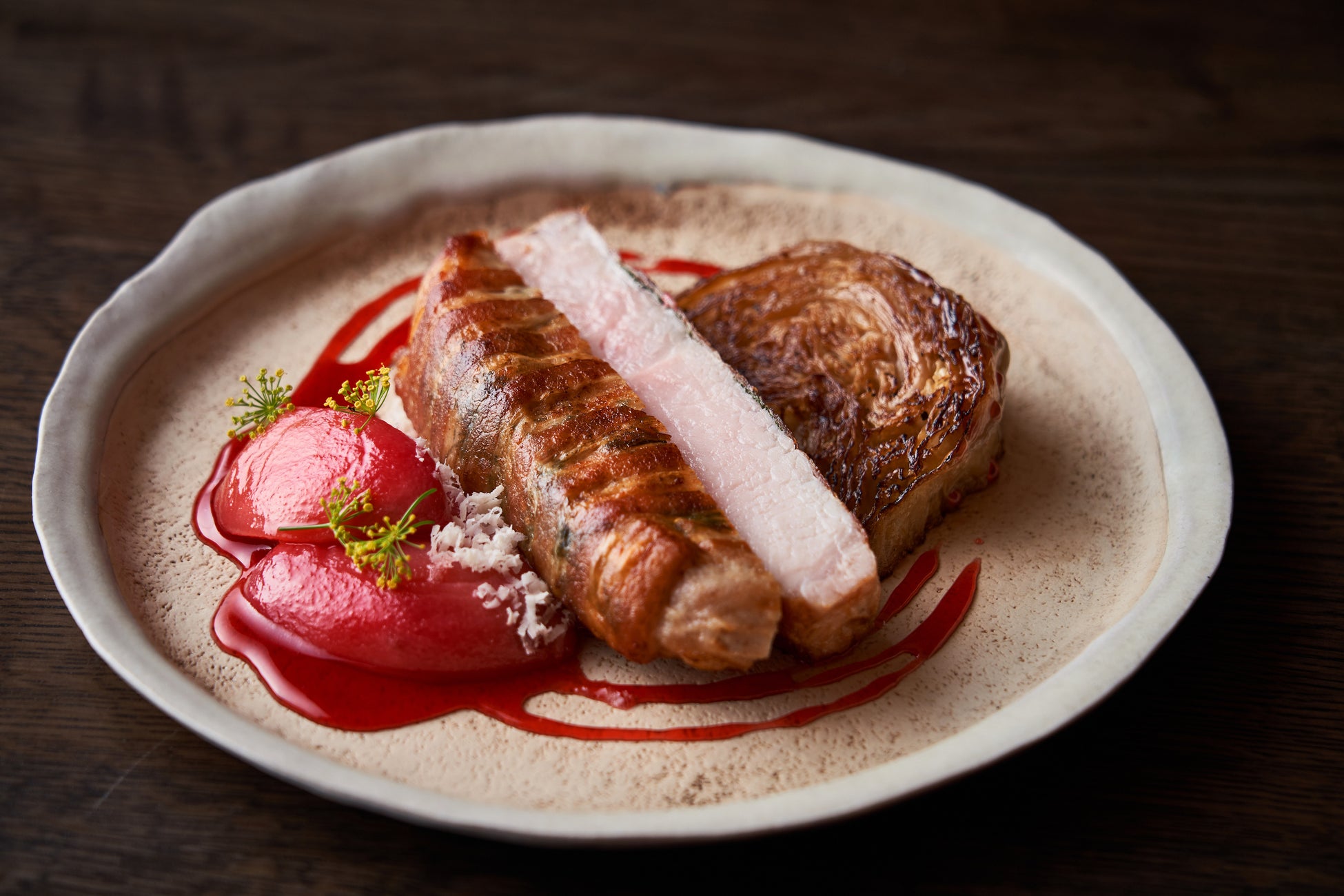 胡麻のクラストと信州サーモンの蒸し焼き、チェリートマト クリスピーライス、味噌と柚子のスープ or 加藤ファームの豚ロース、ベーコン アプリコット、キャベツとホースラディッシュ 暖かいチョコレートケーキ バニラアイスクリーム or 柚子、苺 ポッピーシードヨーグルトソルベ、 クリスピーメレンゲ |