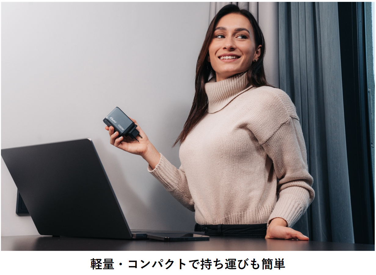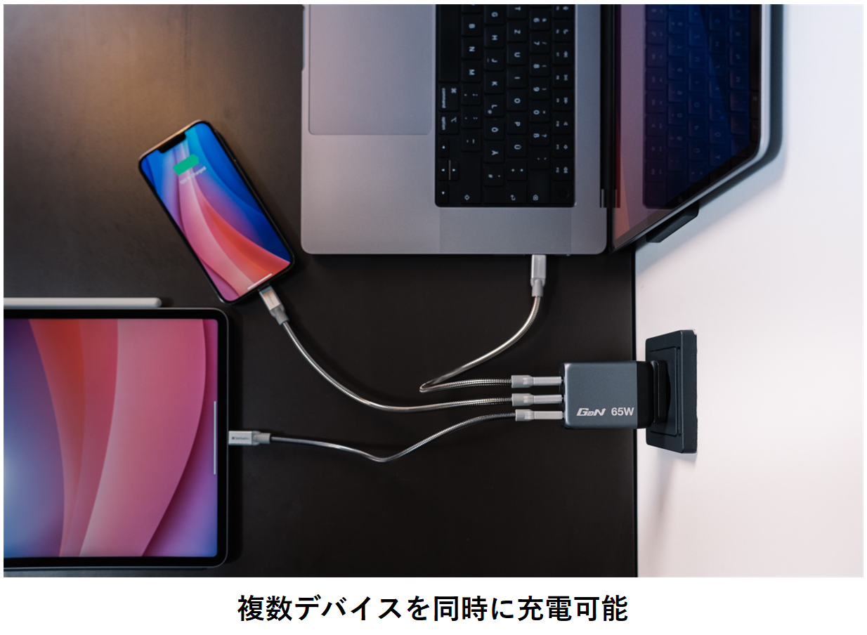 次世代半導体素材「GaN(窒化ガリウム)」搭載で、高出力ながら軽量・コンパクトデザインを実現。PD3.0 PPSおよびQC3.0対応で、充電時の発熱を抑えながら、高速でスマートフォンやタブレットなどのデバイスを充電することが出来ます*。(*PD対応のデバイスを使用した場合)