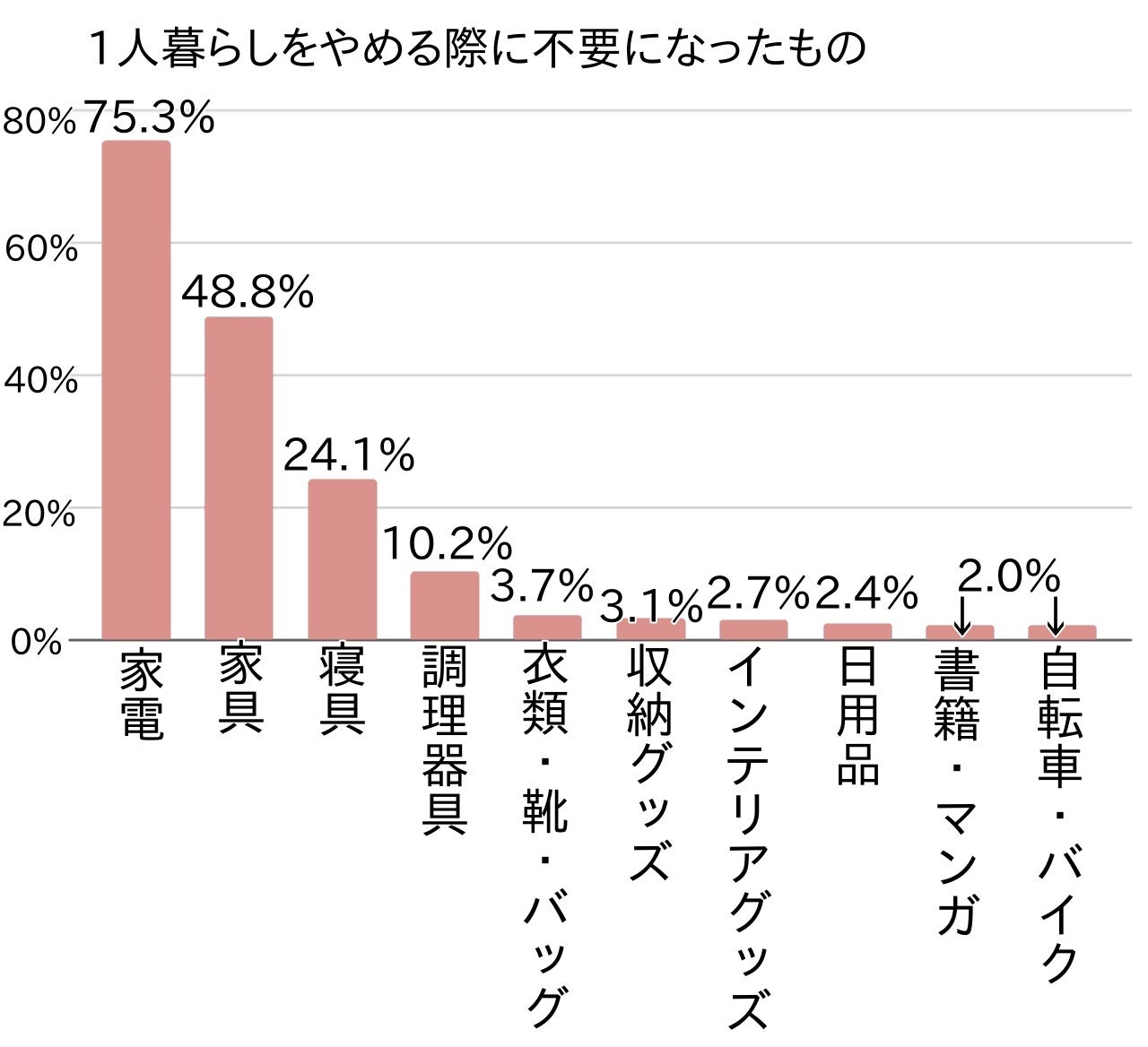 どのようなケースにおいても、1人暮らしをやめると何らかのものが使えなくなり、処分する場合が多いといえます。実際、1人暮らしをやめて不要になったものがあると答えた方は86.3%でしたが、その際に、具体的に不要になったものは何だったのでしょうか。