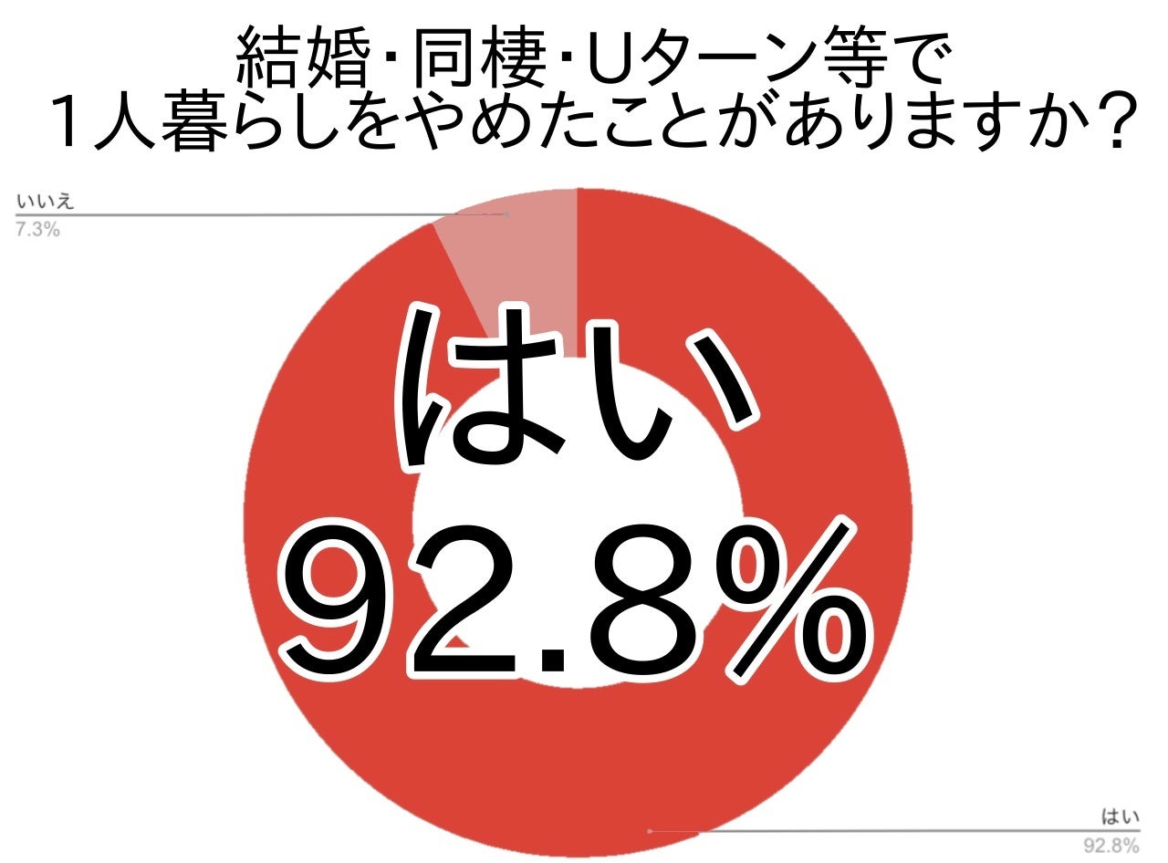 今回の調査では、結婚・同棲・Uターン等で1人暮らしをやめた経験のある方は92.8%という結果になりました。想像より多かったと感じている方が多いかもしれません。