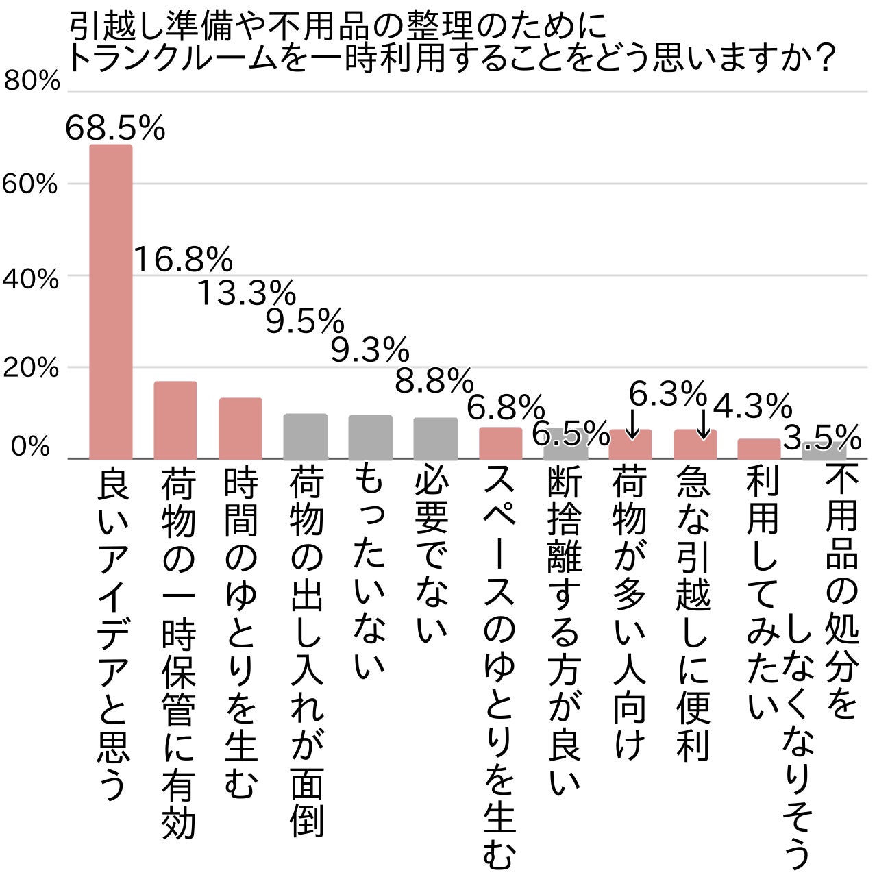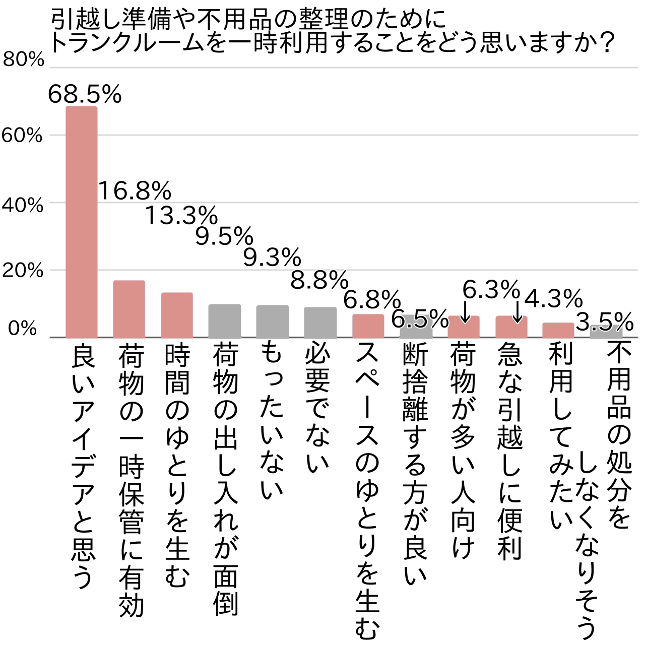 また、荷物が多い方の引越しに便利で、急な引越しの際にも便利に使える(各6.3%)ことや、実際に引越しを経験して「あの時トランクルームがあったら利用したかった」「今後使ってみたい」という意見も多くありました(4.3%)。