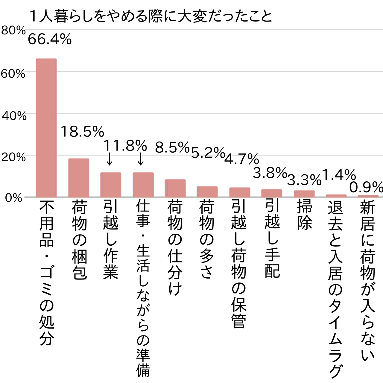 問題をさらに深く掘り下げるために、1人暮らしをやめるための引越しやそれに伴う不用品処分等において、具体的に何が大変だったかを尋ねました。