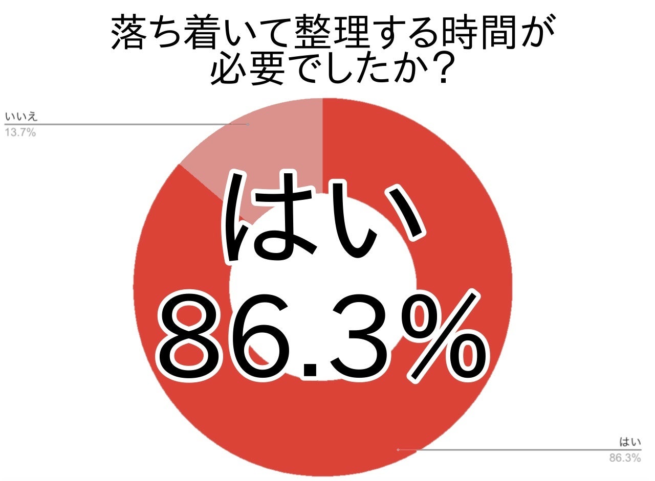 落ち着いて荷物を整理する時間が必要だったと答えた方は86.3%で、ほとんどの方が時間をゆっくりかけて荷物整理したかったと感じていたことがわかりました。限られた時間の中で、タイムリミットに合わせた急ぎの荷物整理となった方の多さを示す結果とも言えるでしょう。