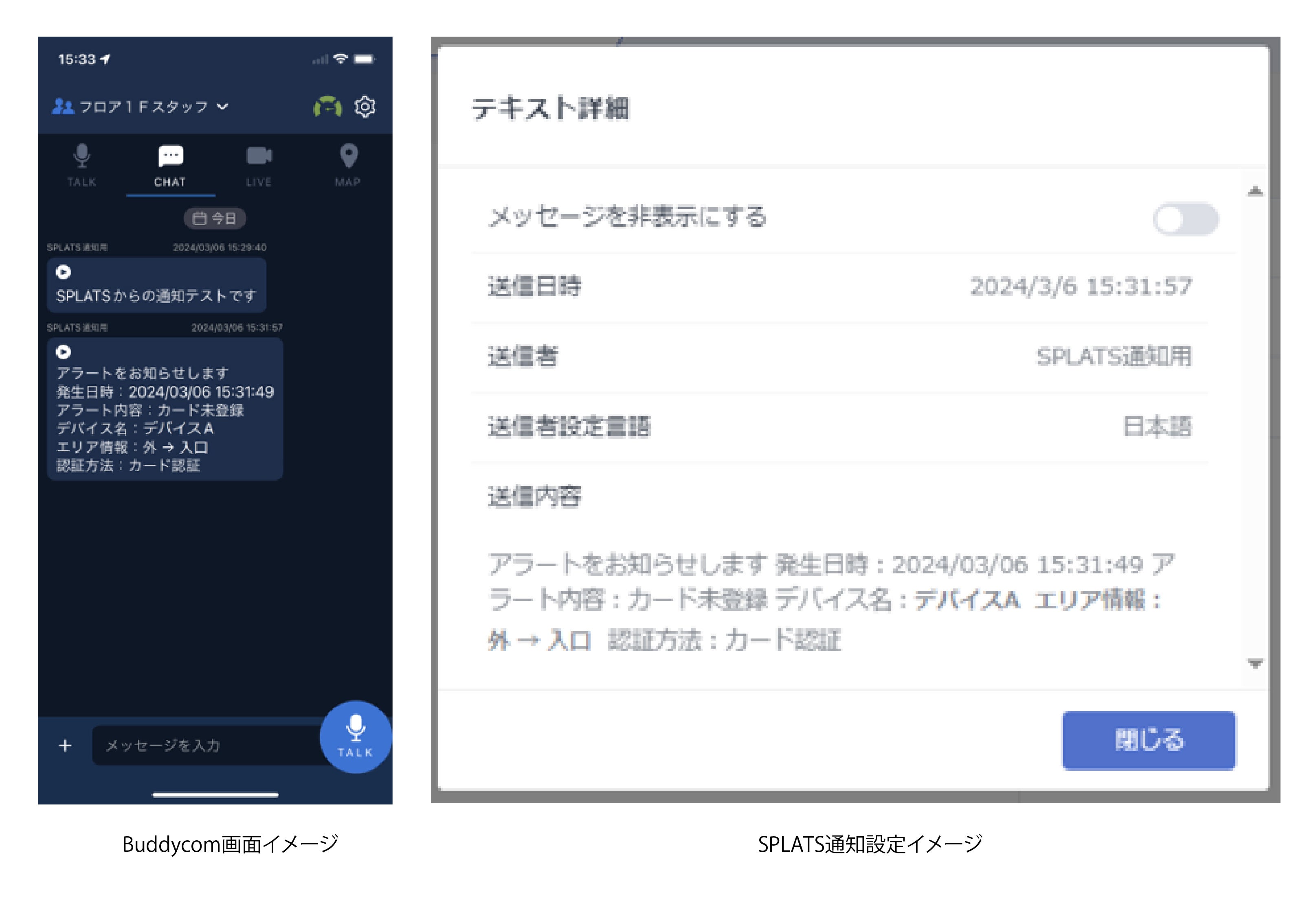 「SPLATS」と「Buddycom」が連携することで、物理セキュリティに関わる重要な情報を迅速かつ確実に共有することが可能となります。文字情報だけでは見逃されがちなアラートを関係者全員に音声で一斉送信することで、緊急時の対応を迅速に行うことを実現します。