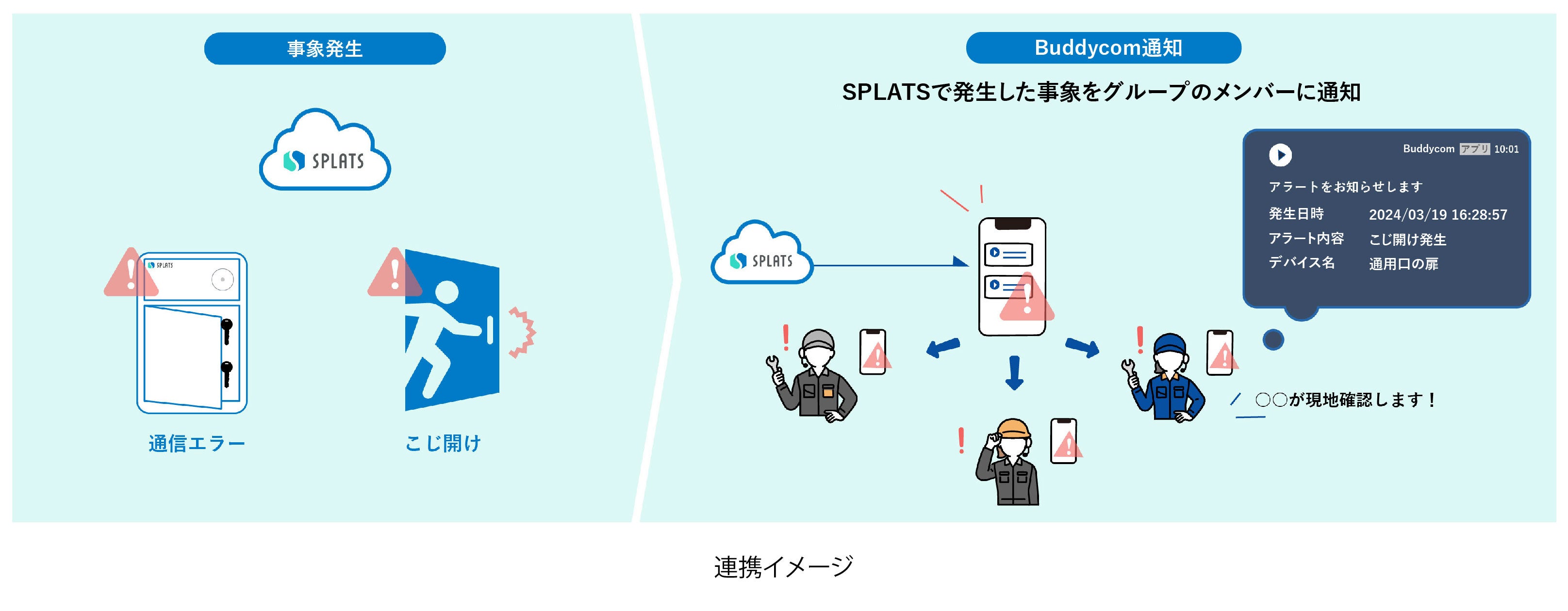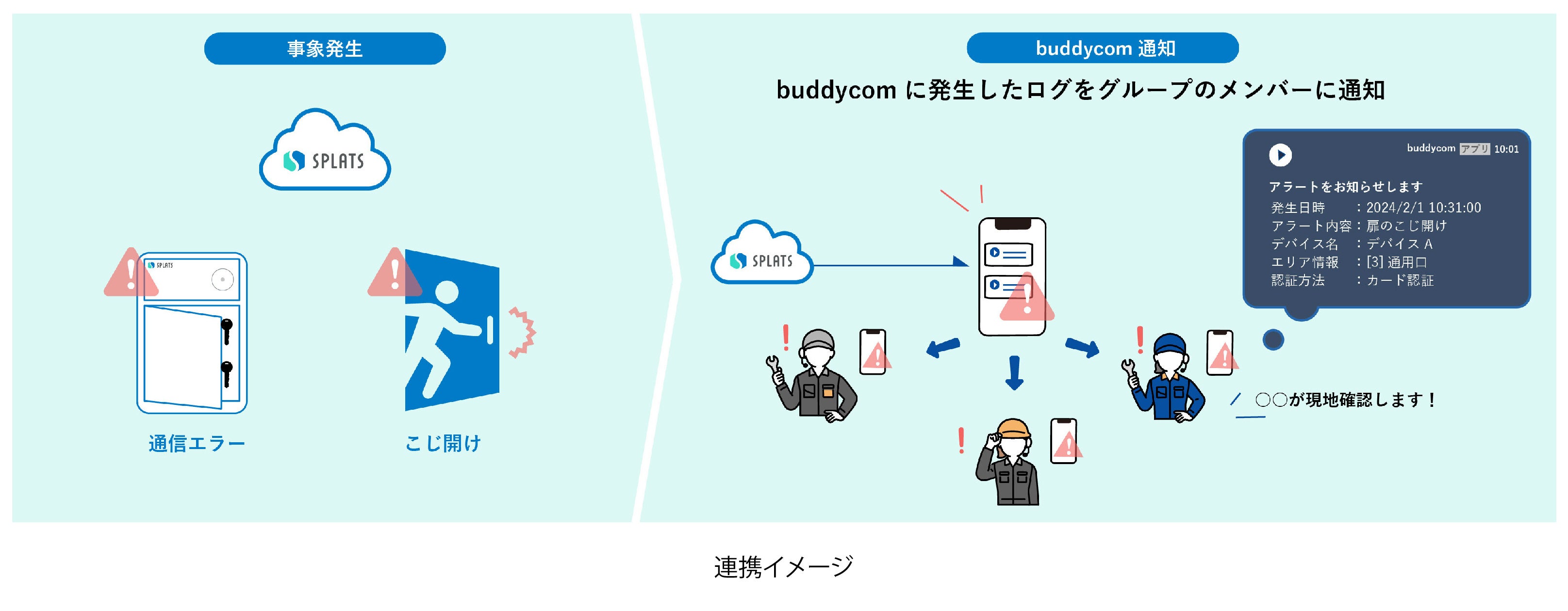 SPLATSとBuddycomでは、今回実現したアラートの通知のほか、特定のメンバーの入室/カギの利用など、通知可能なログの種類を増やすことでお客様対応の質を向上させるなど、接客のシーンなどにおいても活用できる連携開発を進め、デスクレスワーカーの業務効率化を実現します。