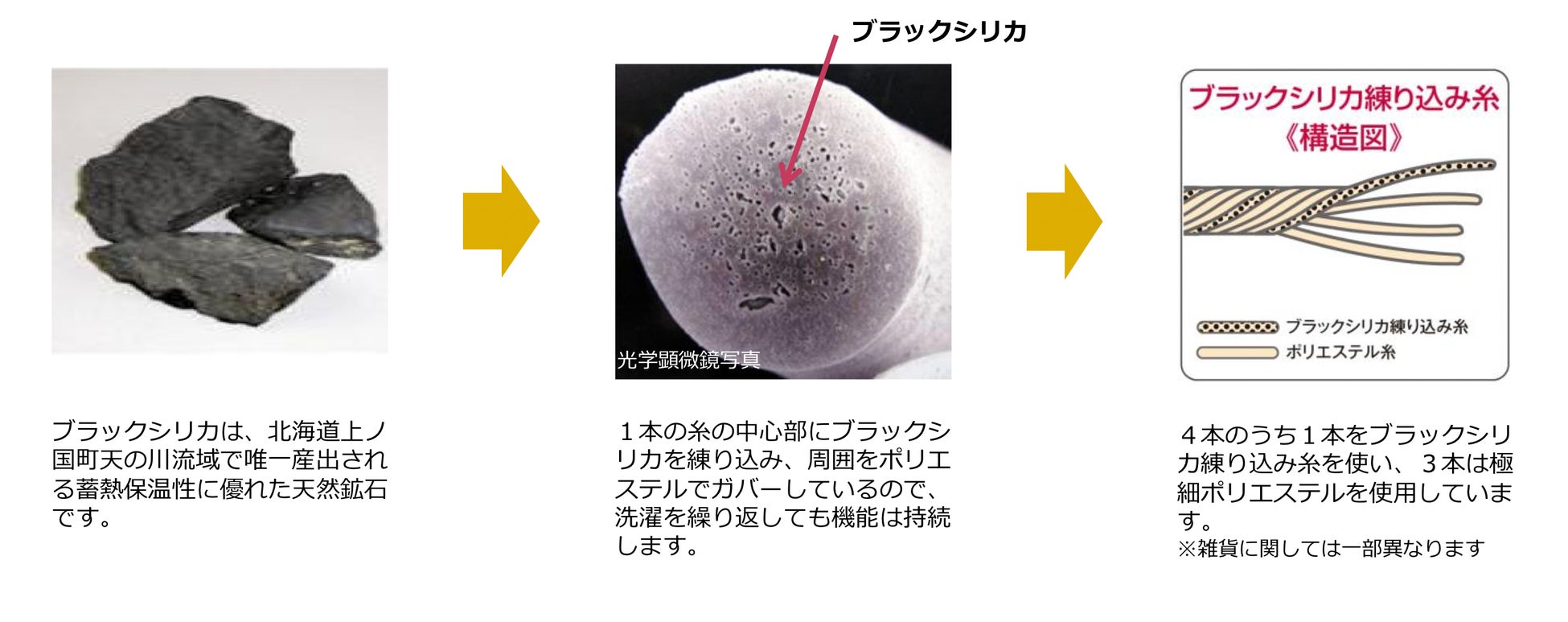 常温で遠赤外線放射などさまざまな効果があるといわれるブラックシリカをポリエステル糸に練り込んでいます。椿オイル加工でやわらかい