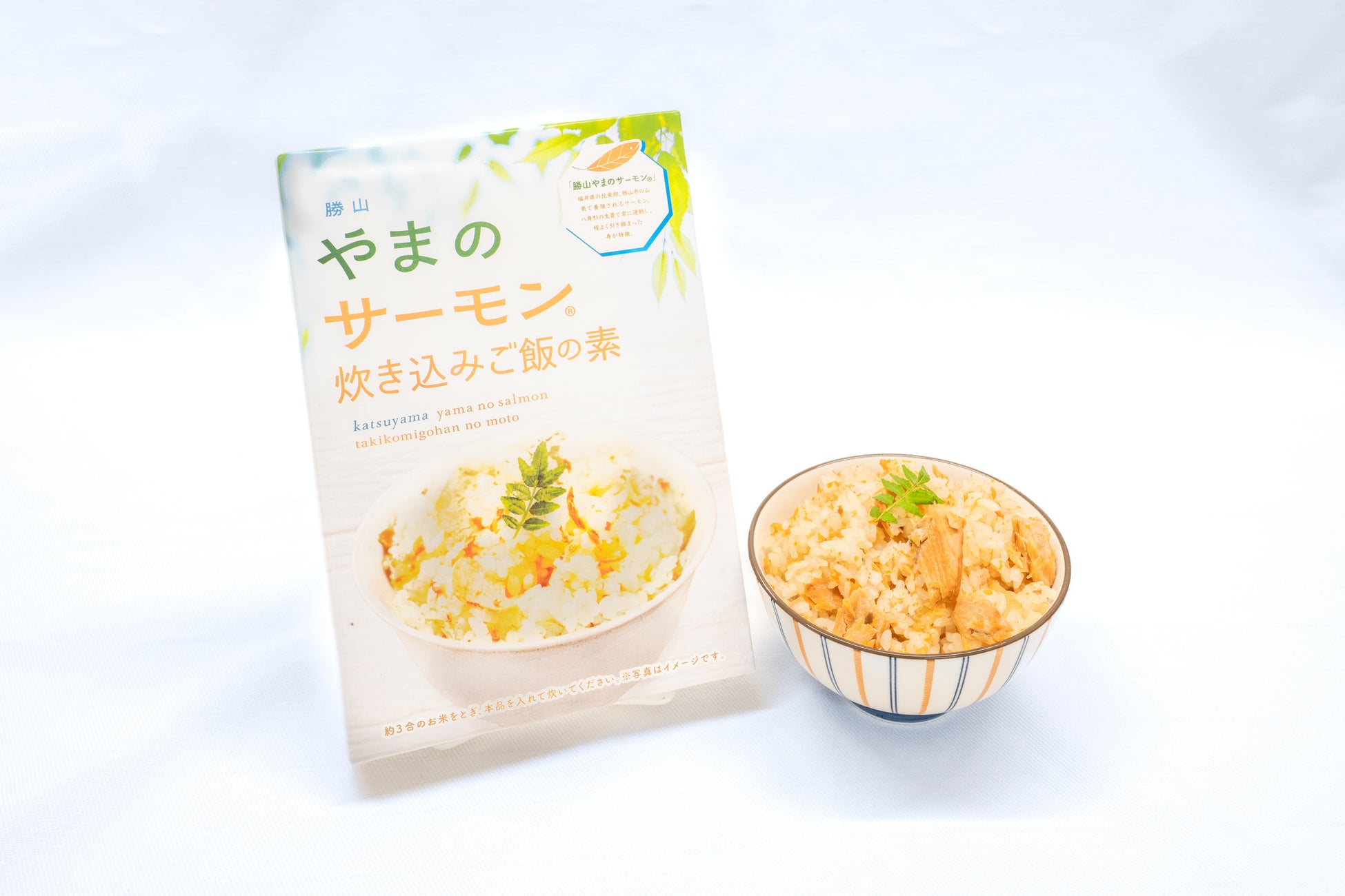 今回販売する「勝山 やまのサーモン炊き込みご飯の素」は、ご家庭で手軽に「勝山 やまのサーモン」を楽しんでいただくために開発した商品です。本品1袋とお米3合を炊飯器に入れ、炊くだけで、サーモンのうまみが詰まった炊き込みご飯が完成します。