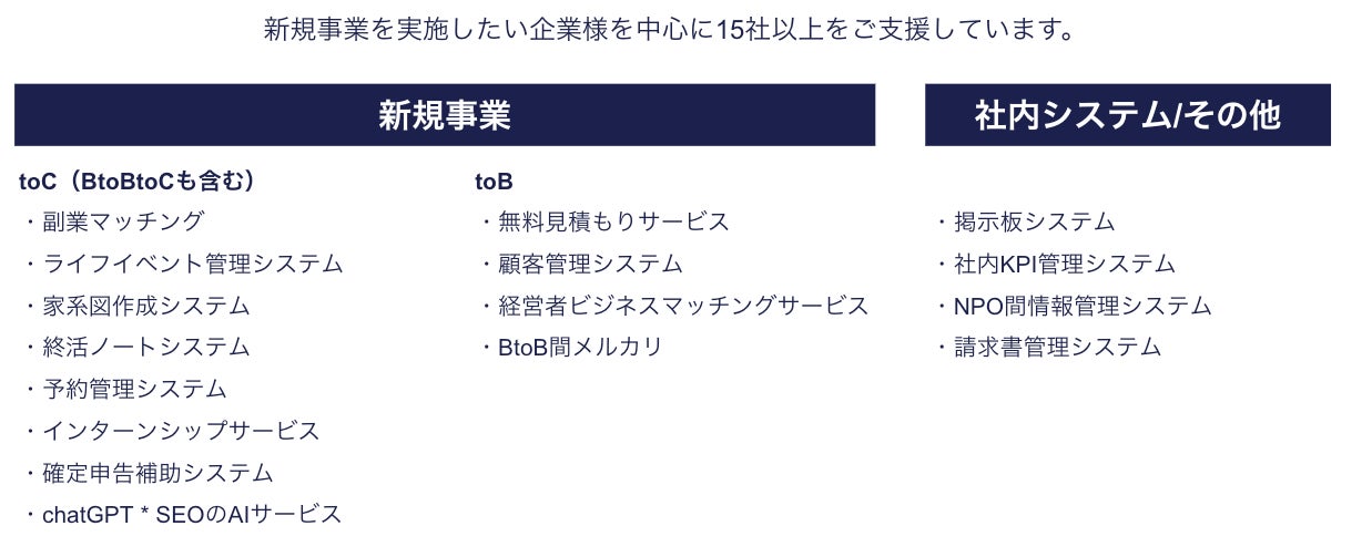 そのため、顧客管理などの業務システムからマッチングサイトなどの新規webサービスまで幅広く対応が可能です。