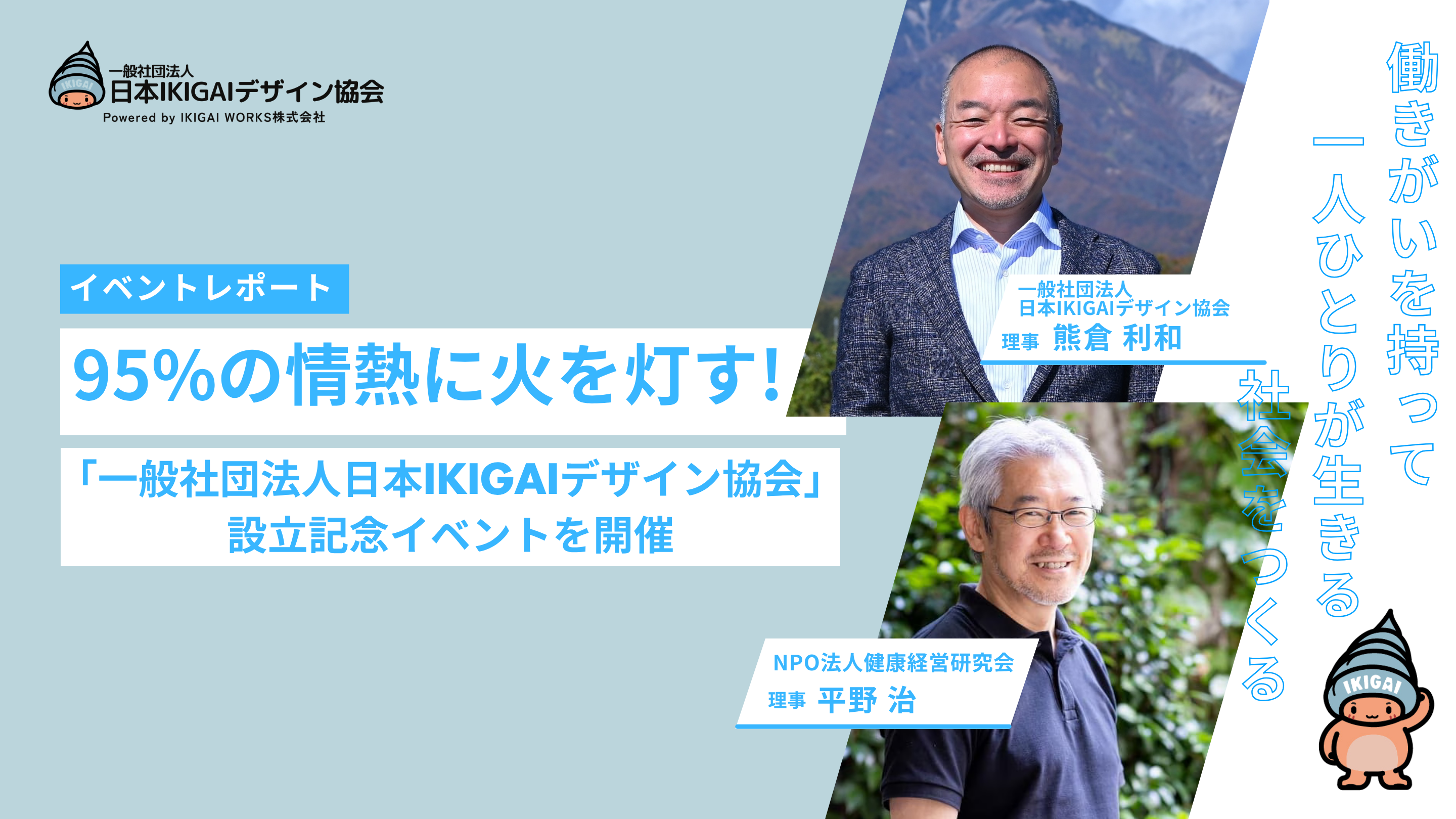 一般社団法人日本IKIGAIデザイン協会(本社:山梨県北杜市、代表理事:熊倉 利和)と、IKIGAI WORKS株式会社(本社:山梨県北杜市、代表取締役:熊倉 利和)は、「誰もが仕事に働きがい、人生に"生きがい"を持てる社会にする」という情熱のもと活動しています。
