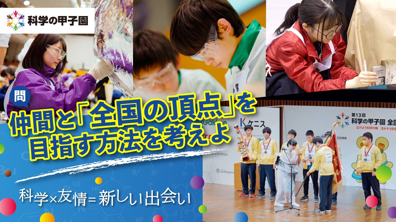 「科学の甲子園」は、全国の中高生がそれぞれ集まり、科学の知識だけでなく知恵とチームワークを駆使して、数々の挑戦を乗り越える、夢の舞台です。皆さんの好奇心を刺激し、新たな発見とともに成長できる場。それが「科学の甲子園」です。仲間とともに解決する難問や、目の前で起こる現象の謎を解き明かす楽しさを、一緒に味わいましょう。ここでの経験は、皆さんの未来への大きなステップとなります。また、同じ志を持つ全国の同世代と出会い、競い合い、支え合うことで、深い絆が生まれます。この大会で得た友人は、一生の宝物となるでしょう。さあ、「科学の甲子園」に参加して、自分たちの可能性を試してみませんか?全国大会でお待ちしています!