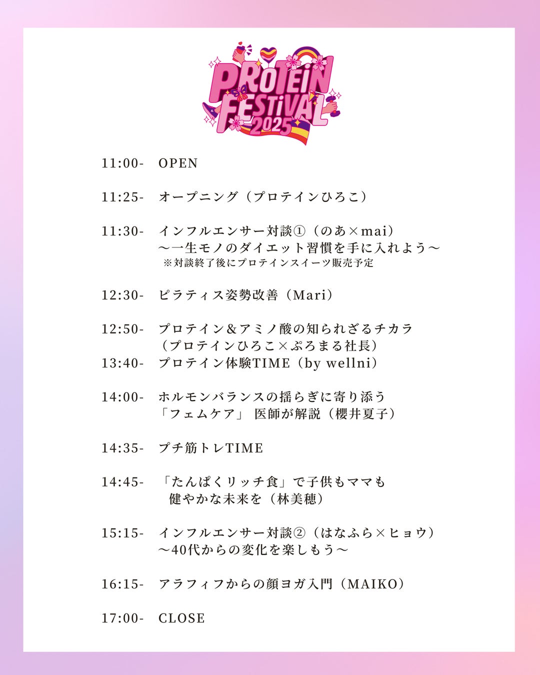 プロテイン=筋トレのイメージを超え、美容・健康・ライフスタイルの一部として楽しむためのイベントです。各分野の専門家によるトークショーやワークショップ、試飲・試食体験ブースを通じて、楽しく学びながら美と健康をアップデートできます。