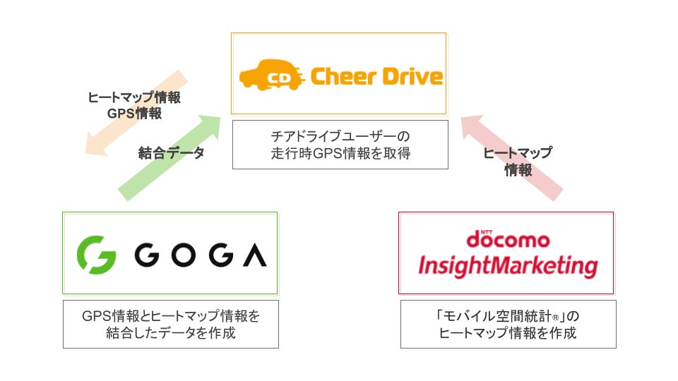 モバイル空間統計®️は、ドコモの携帯電話ネットワークのしくみを使用して作成される人口の統計情報であるを活用し、1時間ごとの人口を24時間365日把握することができるサービスです。株式会社ドコモ・インサイドマーティングがモバイル空間統計®️をもとに作成したヒートマップ情報をチアドライブに提供し、チアドライブはヒートマップ情報とCheer Driveのアプリに搭載されたGPS情報をゴーガに連携、ゴーガがそれぞれを結合したデータを作成、チアドライブに提供することで新システムの開発を支援する形となりました。