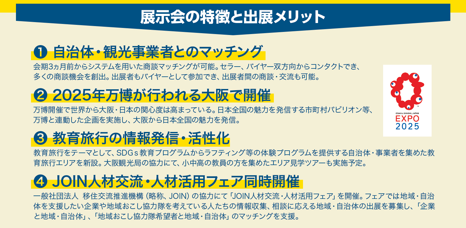 教育旅行をテーマとして、SDGs教育プログラムからラフティング等の体験プログラムを提供する自治体・事業者を集めた教育旅行エリアを新設。大阪観光局の協力にて、小中高の教員の方を集めたエリア見学ツアーも実施予定。