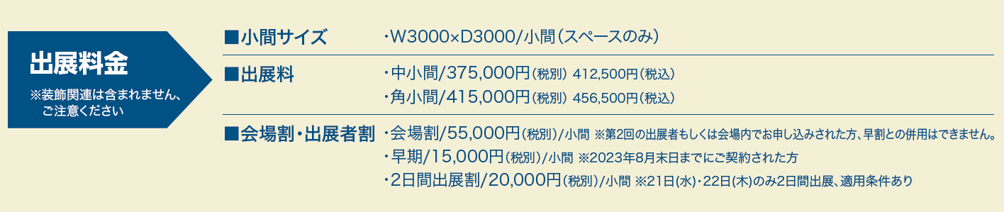 ・2日間出展割/20,000円(税別)/小間 ※21日(水)・22日(木)のみ2日間出展、適用条件あり
