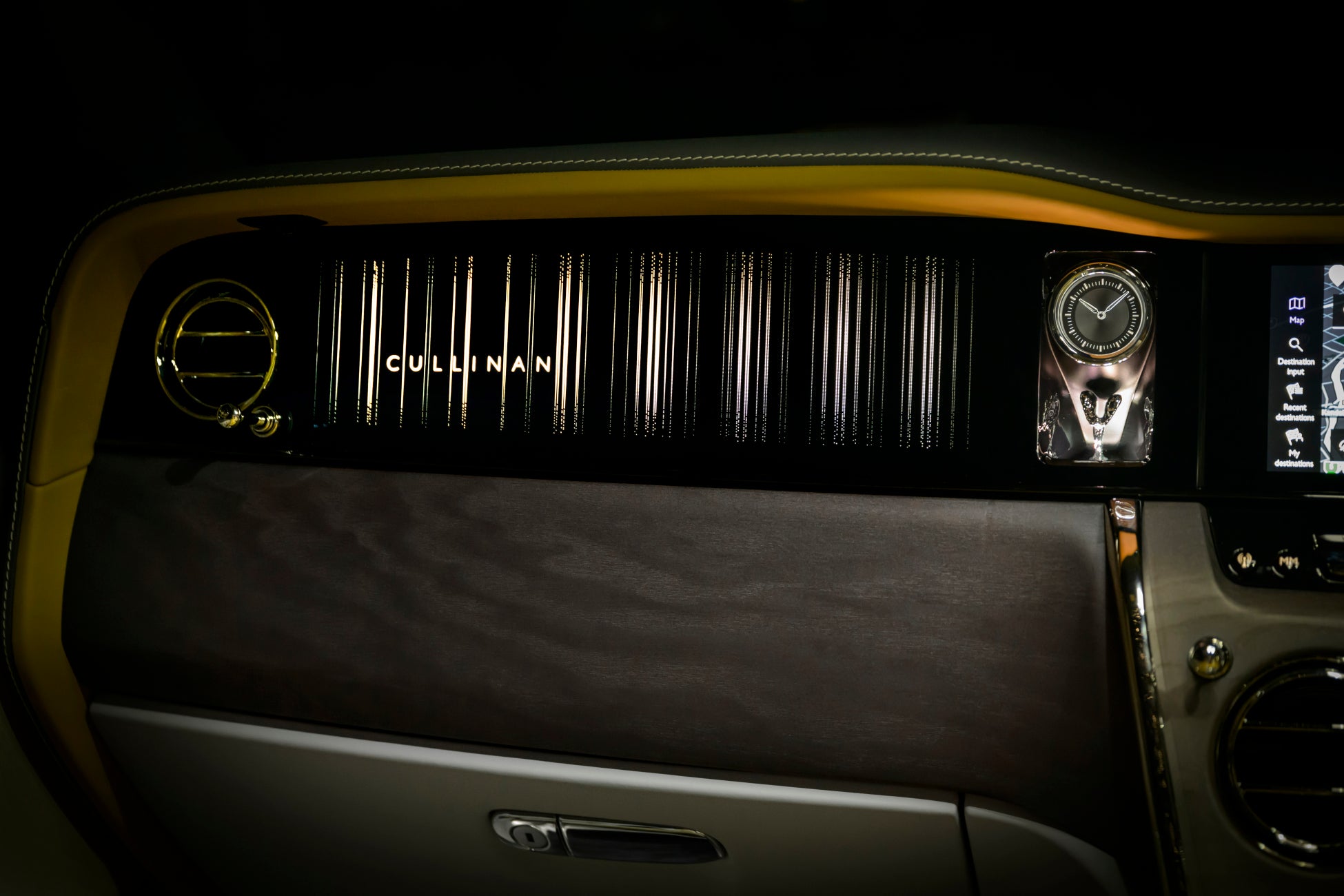 助手席前部には、イルミネーテッド・フェイシア・パネルが配置されています。スペクターにも採用されているこのイルミネーテッド・フェイシアは、特別に開発された技法によりレーザーで7,000ものドットがエッチングされ、Cullinanの文字と世界大都市の夜空に浮かぶ摩天楼からインスピレーションを得たグラフィックが光で浮き上がります。この既成のデザインに加えて、お客様ご自身でビスポークのイルミネーテッド・フェイシアのモチーフをつくることもできます。