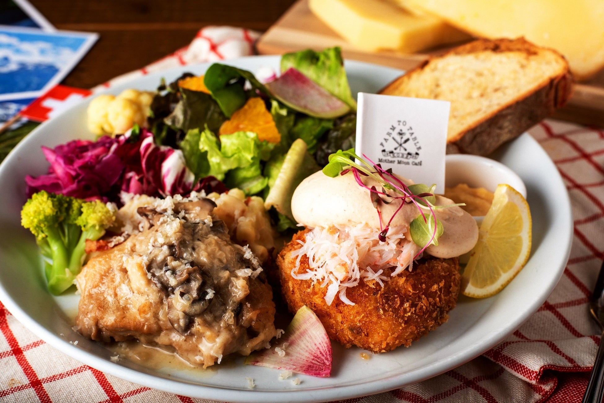 メインは兵庫県香美町「香住ガニ」のクリームコロッケ、スペシャルデリには鶏モモ肉とブラウンマッシュルーム ママン特製スイス風クリーム煮込み。スイスの要素を取り入れた、プレートを彩る3種のデリ、アルペンマカロニ、林檎と紫キャベツのピクルス、林檎とオリーブオイルのコンディマンなど、一皿で前菜からメインまで楽しめます。