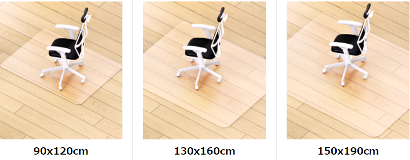 チェアマットの素材にはさまざまな種類があり、「PVC(ポリ塩化ビニル)製」のチェアマットは安価で、サイズも三つ揃っています。