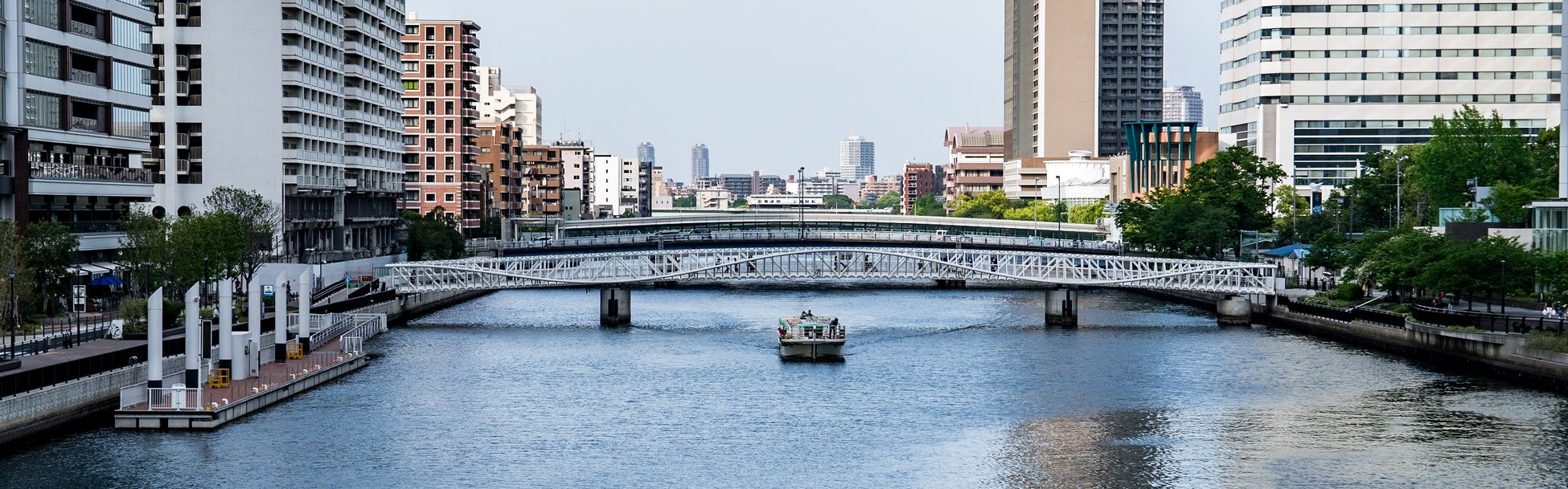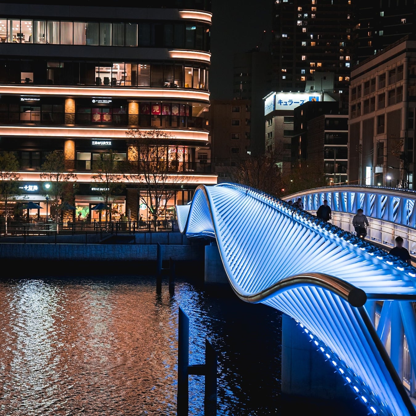 勝どき駅と晴海三丁目を結ぶ歩行者専用橋「黎明小橋(れいめいこばし)」は、2024年3月25日に開通しました。朝潮運河をまたぎ、勝どきエリアの新たな賑わいと憩いの場として広大な緑地と水辺を抱く街「GRAND MARINA TOKYO」へとつながる同橋は、水面に波打つような柔らかな曲線のデザインが、おだやかな波のイメージを表現しています。連続する白い部材を水上に浮かべる構成により、繊細な動きが水面のきらめきと重なり、ウェーブの美しさを際立たせています。さらに、水面に映り込む橋の姿は、重なり合ういくつもの波を思わせます。