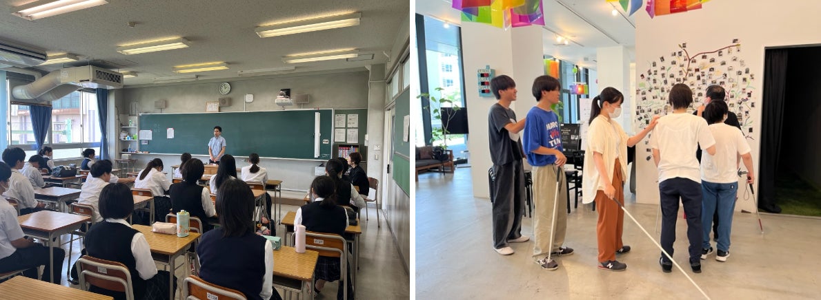 7月に行った講演では、視覚障害者スタッフの谷口真大が講師を務め、「ダイバーシティ&インクルージョン」をテーマに、視覚障害を生かし働くことの意義や、共生社会実現に向けてできること、「違い」を生かすことの重要性について語りました。また、後日行われた「ダイアログ・イン・ザ・ダーク」体験では、生徒たちが真っ暗闇の中、視覚障害者に導かれながら様々なアクティビティに挑戦しました。