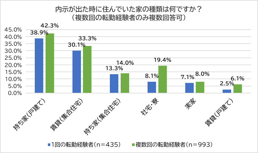 また、複数回は「持ち家(集合住宅)」よりも「社宅・寮」(1回:8.1%、複数回:19.4%)の方が多い結果となりました。企業によっては転勤者の借上げ社宅制度もあるため、複数回は「社宅・寮」の割合が多いことも考えられます。