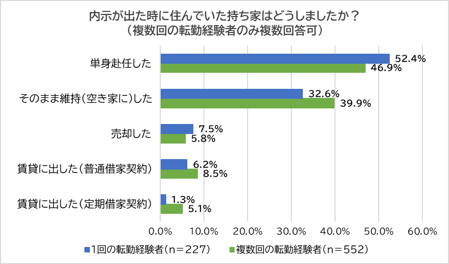 今度は、持ち家(戸建て・集合住宅)に住んでいた転勤経験者に「内示が出た時に住んでいた持ち家は?どうしたか?」尋ねました。こちらも転勤回数に関わらず最多は「単身赴任」(1回:52.4%、複数回:46.9%)で、「そのまま維持(空き家に)した」(1回:32.6%、複数回:39.9%)となり、1回は「売却した」(1回:7.5%、複数回:5.8%)と続きましたが、複数回は「賃貸に出した(普通借家契約)」(1回:6.2%、複数回:8.5%)の方が多い結果となりました。