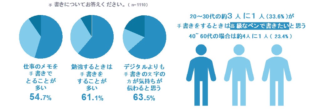 加えて、「仕事のメモを手書きでとることが多い」人が全体の54.7%、「勉強するときは手書きをすることが多い」が61.1%、「デジタルよりも、手書きの文字の方が気持ちが伝わると思う」が63.5%と、多くの人が手書きならではの良さを感じていることが判明しました。また、「手書きをするときは高級なペンで書きたいと思う」と答えた人は40~60代は23.4%と約4人に1人の割合でしたが、20~30代では33.6%と、若い世代に限ると約3人に1人がそのように考えていることが明らかになっています。